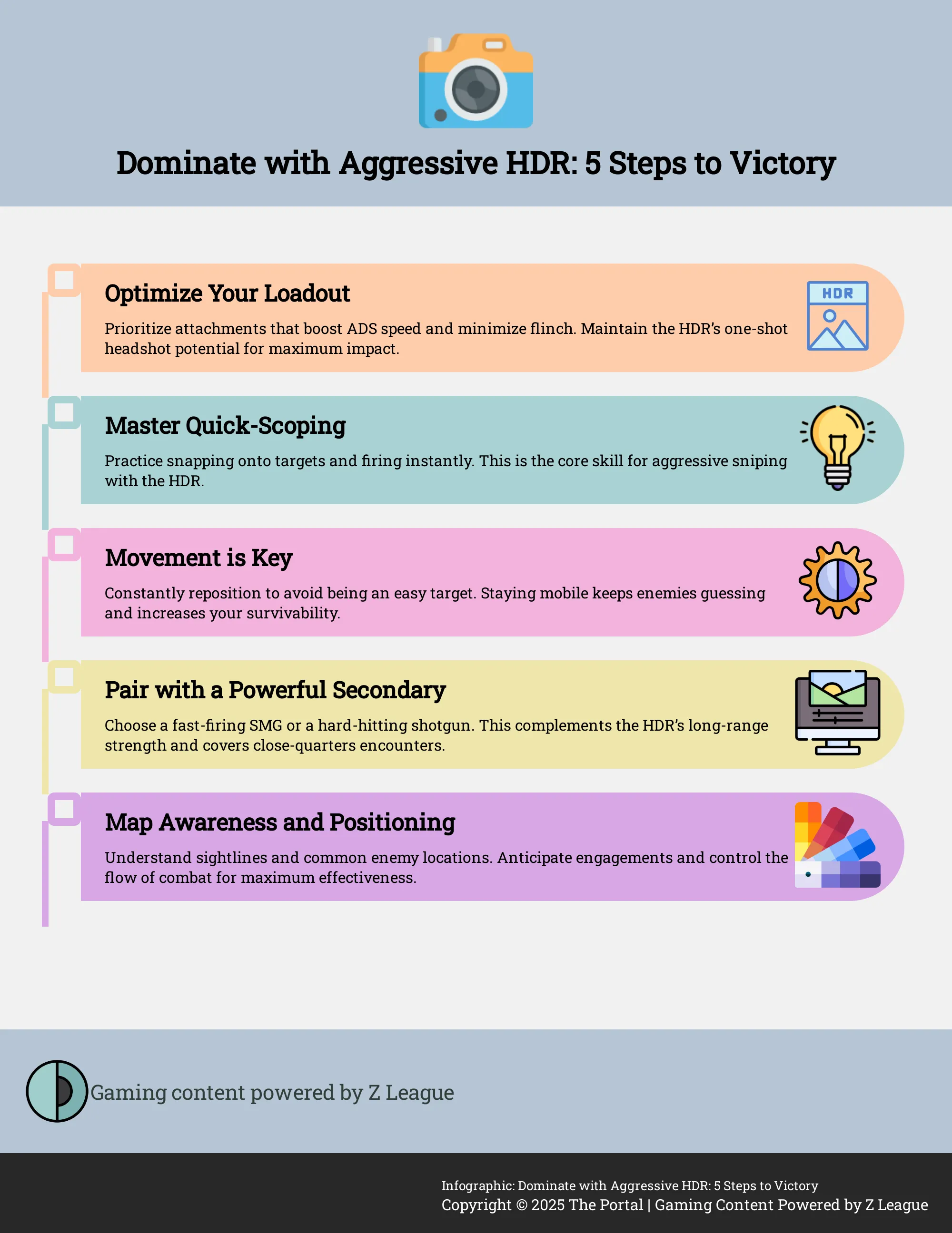 Использование тактического снаряжения умно повышает ваш агрессивный подход к игре. Дистракционные гранаты или ослепляющие вспышки могут сбить с толку противников, давая вам преимущество в ближнем бою. Это может стать возможностью для перехода на запасной оружие и завершения цели. Более того, дымовые бомбы предоставляют укрытие для передислокации или отступления при сильном огне противника. Правильное использование дымовых завес позволяет переместиться в лучшую тактическую позицию или избежать сложной ситуации, когда ваша HDR не работает оптимально. Для дополнительных советов по агрессивному снайпингу с помощью HDR рекомендуется ознакомиться с нашим гайдом по снайперской стрельбе в Warzone.