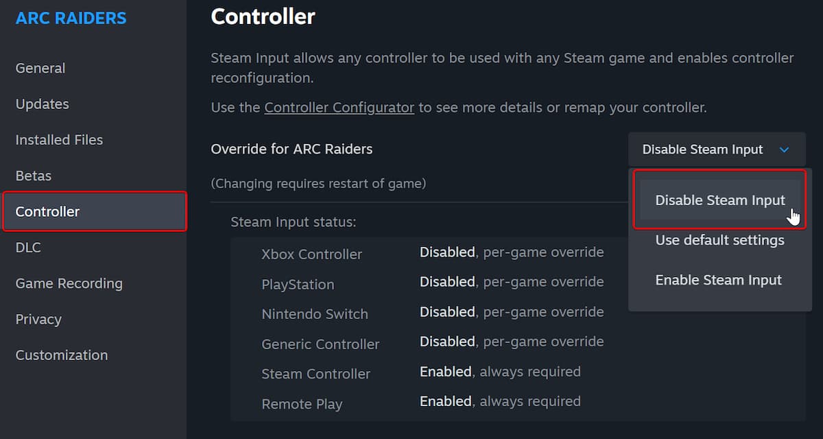 - На вкладке Controller выберите опцию Disable Steam Input в разделе Override for ARC Raiders.
