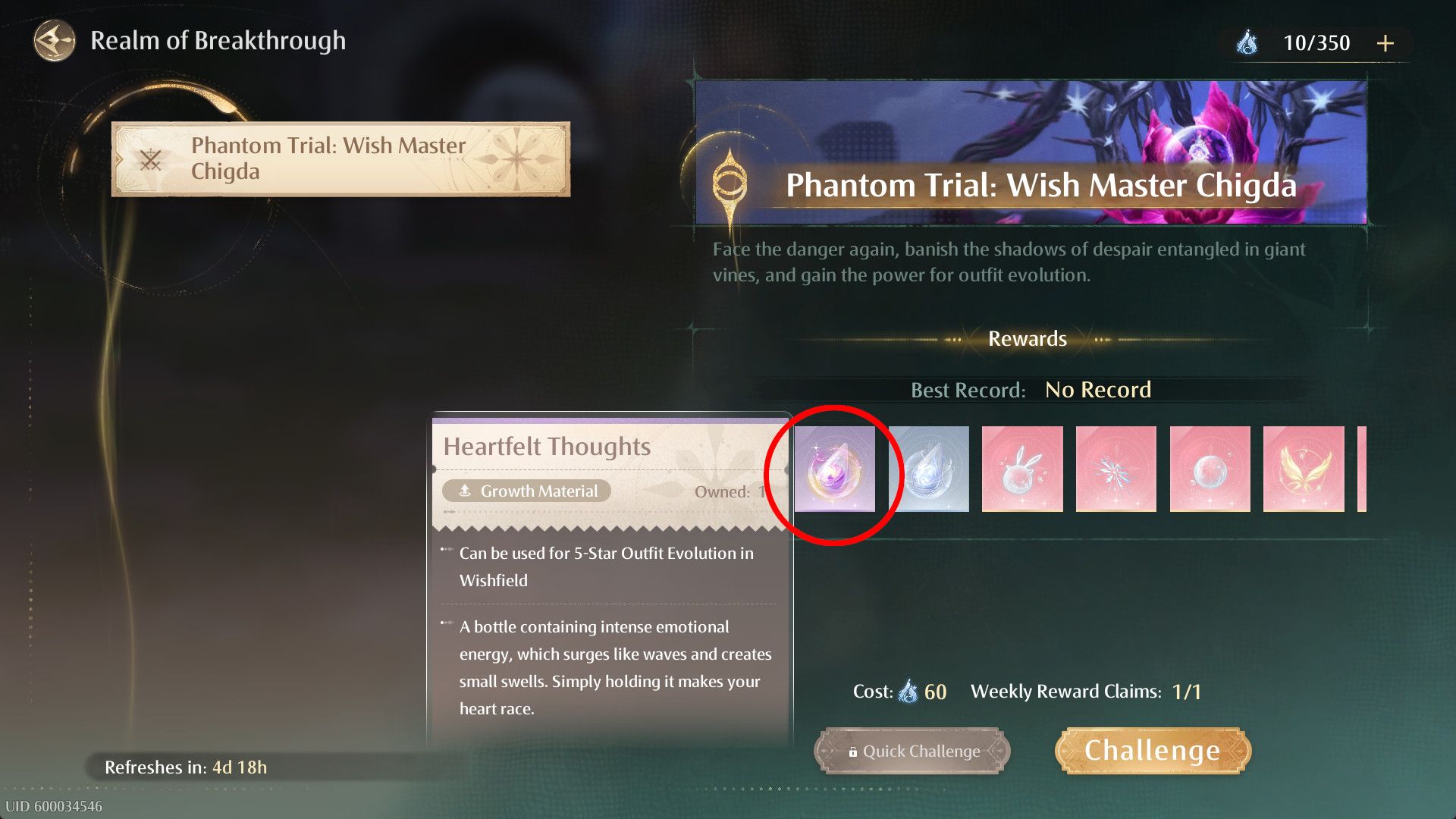 В Infinity Nikki вы можете собирать сердечные мысли только из одного конкретного места, которое называется «Призрачное испытание: Мастер желаний Чигда». Чтобы получить к нему доступ, вам нужно подойти к Шпилю Варпа и выбрать Царство Прорыва. Успешно завершив это Призрачное испытание после предложения 60 единиц жизненной энергии, игроки будут вознаграждены одной сердечной мыслью.