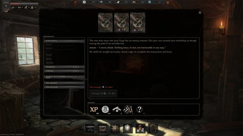 Я был действительно удивлён сюжетным режимом в Bladesong. Хотя сам геймплей довольно прост – вы в основном выполняете базовые задачи, чтобы получить деньги и материалы – написание просто фантастическое. Особенно выделяется насколько неожиданно мрачный сюжет, наполненный темами убийств, коррупции и опасных существ, всё это разворачивается параллельно с игровым процессом кузнеца.