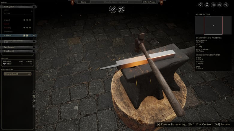 Игроки обладают удивительно детализированным уровнем контроля при создании своих мечей. Вы можете настроить практически каждый аспект клинка – его длину, ширину, сужение, грани и даже изгиб. Фактически, система создания мечей, Bladesong, настолько всеобъемлюща, что напоминает упрощенную версию программы 3D-моделирования, такой как Blender, но специально для мечей. Вы можете создать все, от простого реалистичного меча до фантастического оружия, сосредоточившись либо на практичности, либо на чистой визуальной привлекательности.