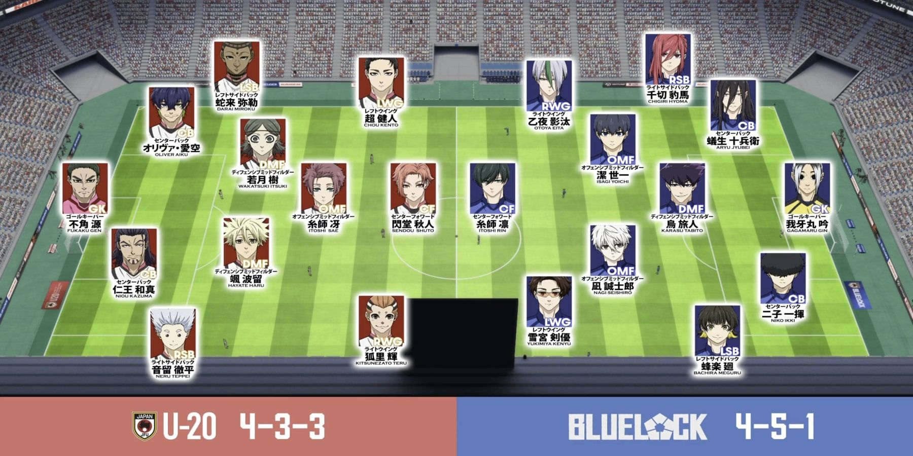 В матче против Blue Lock Eleven сборная Японии U20 выбирает трех полузащитников, принимая схему 4-3-3, которая предлагает ограниченные возможности для инноваций или рискованных действий. Тренер Ясумори Хоичи, несмотря на то, что в обороне находится «четверка железной стены», считает необходимым усилить линию защиты, добавив защиту и в полузащите. Эта тактика имеет смысл, учитывая команду соперника, состоящую из эгоцентричных нападающих, которые не упустят ни одной возможности забить гол.
