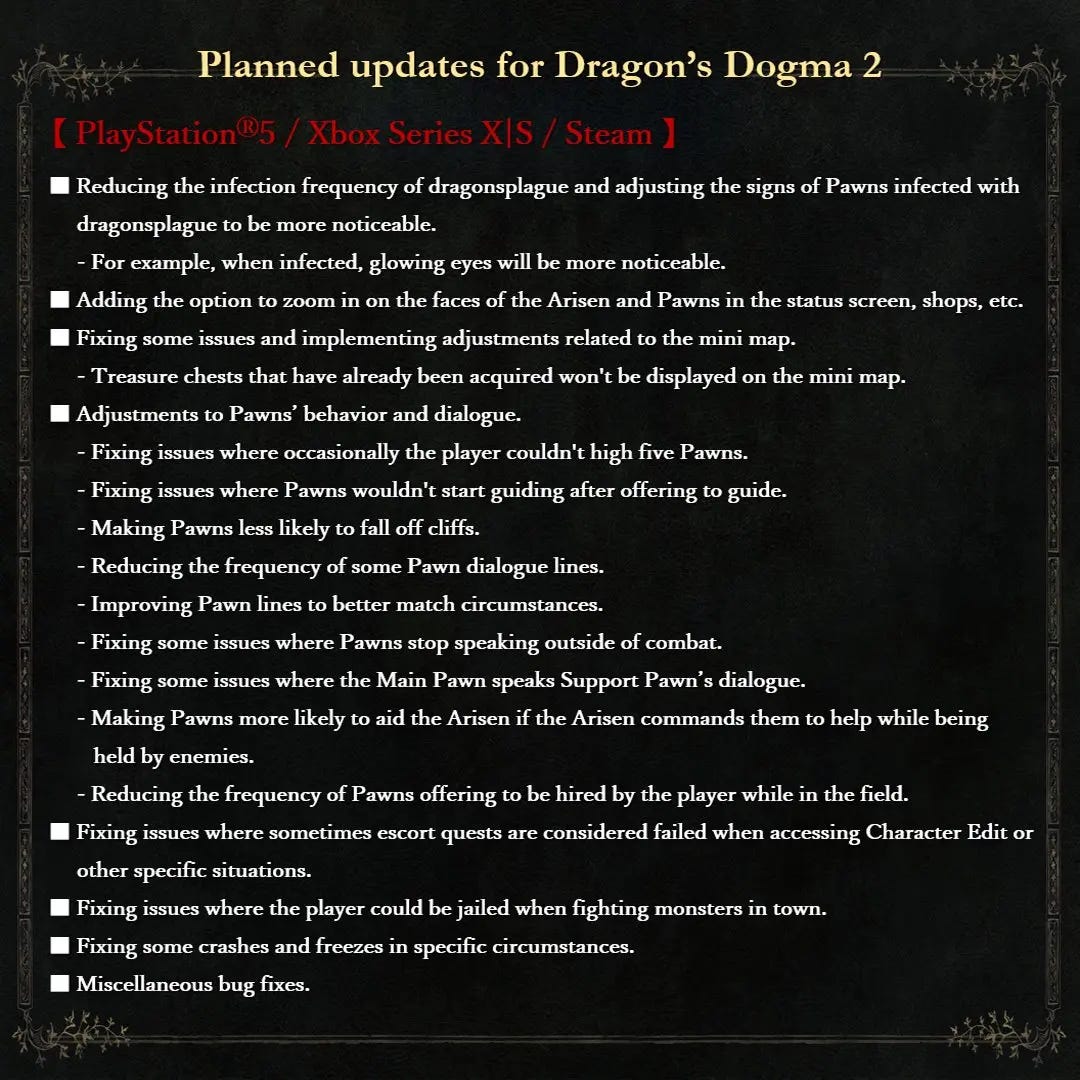 Некоторые дополнительные запланированные исправления: вас не посадят в тюрьму за борьбу с монстрами в городе, а также добавлена возможность масштабировать лица Восставших и Пешек на экранах статуса и магазина. Думаю, это поможет тебе избавиться от признаков драконьей чумы. В любом случае, вот полный план обновления Capcom.