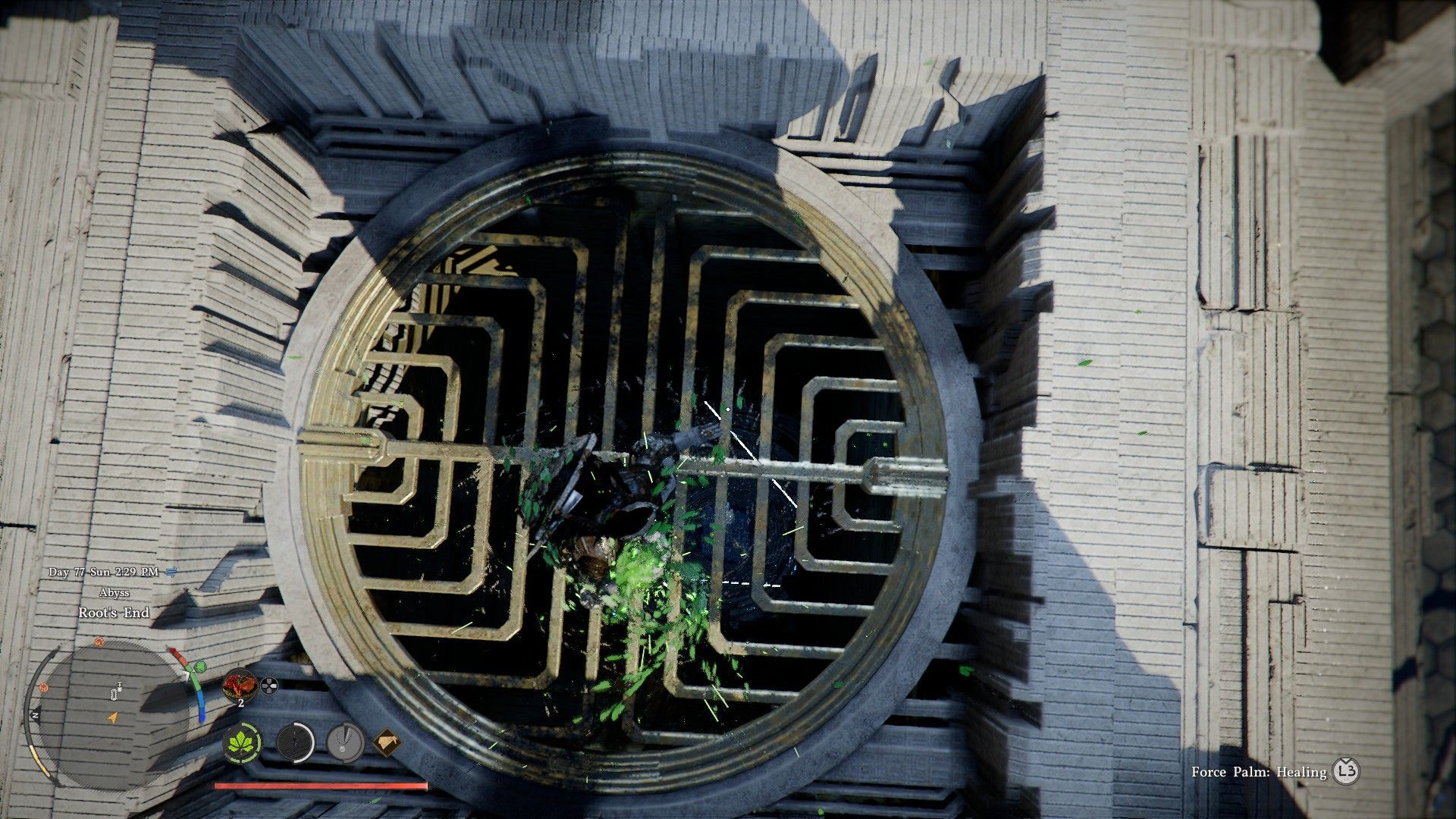 Чтобы войти, направляйтесь к металлической решетке в центре Root’s End. Вы можете открыть её, присев и используя Force Palm на ней. Просто прыгать и использовать Force Palm вниз не сработает – вы должны быть в приседе, чтобы её открыть.