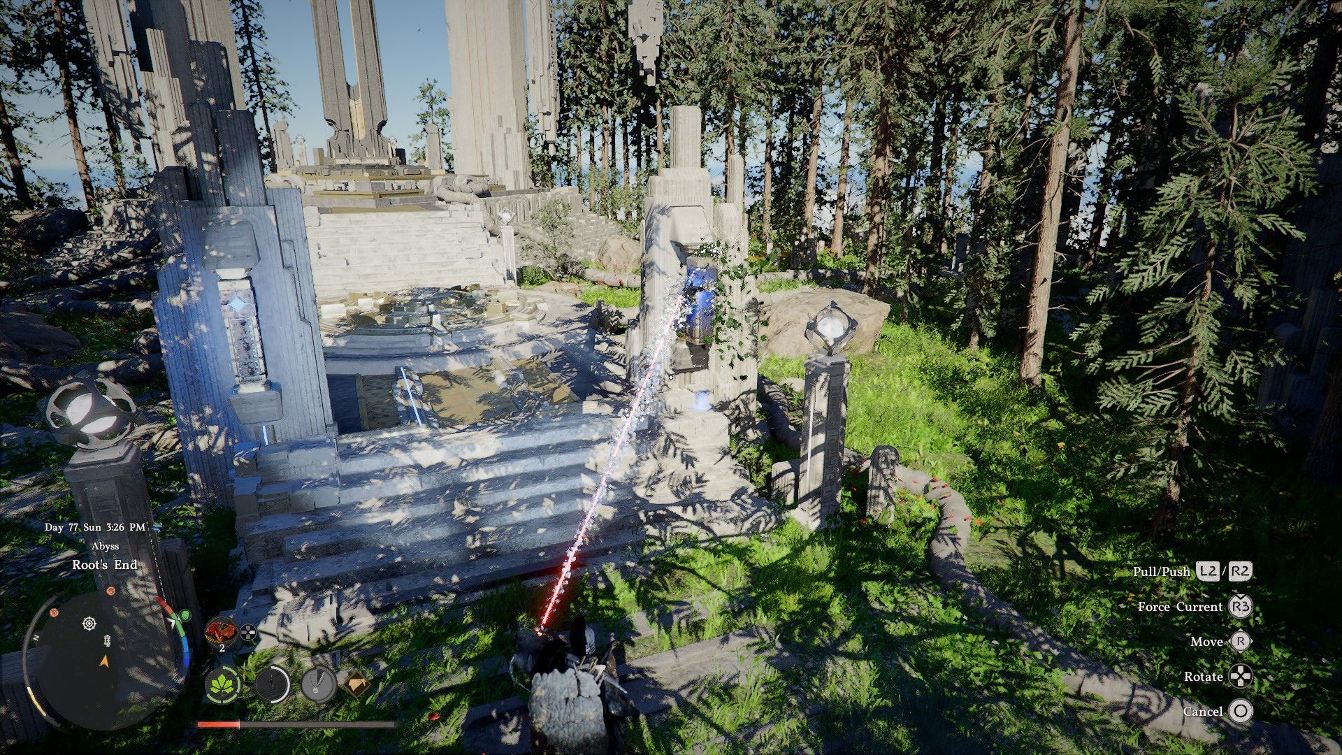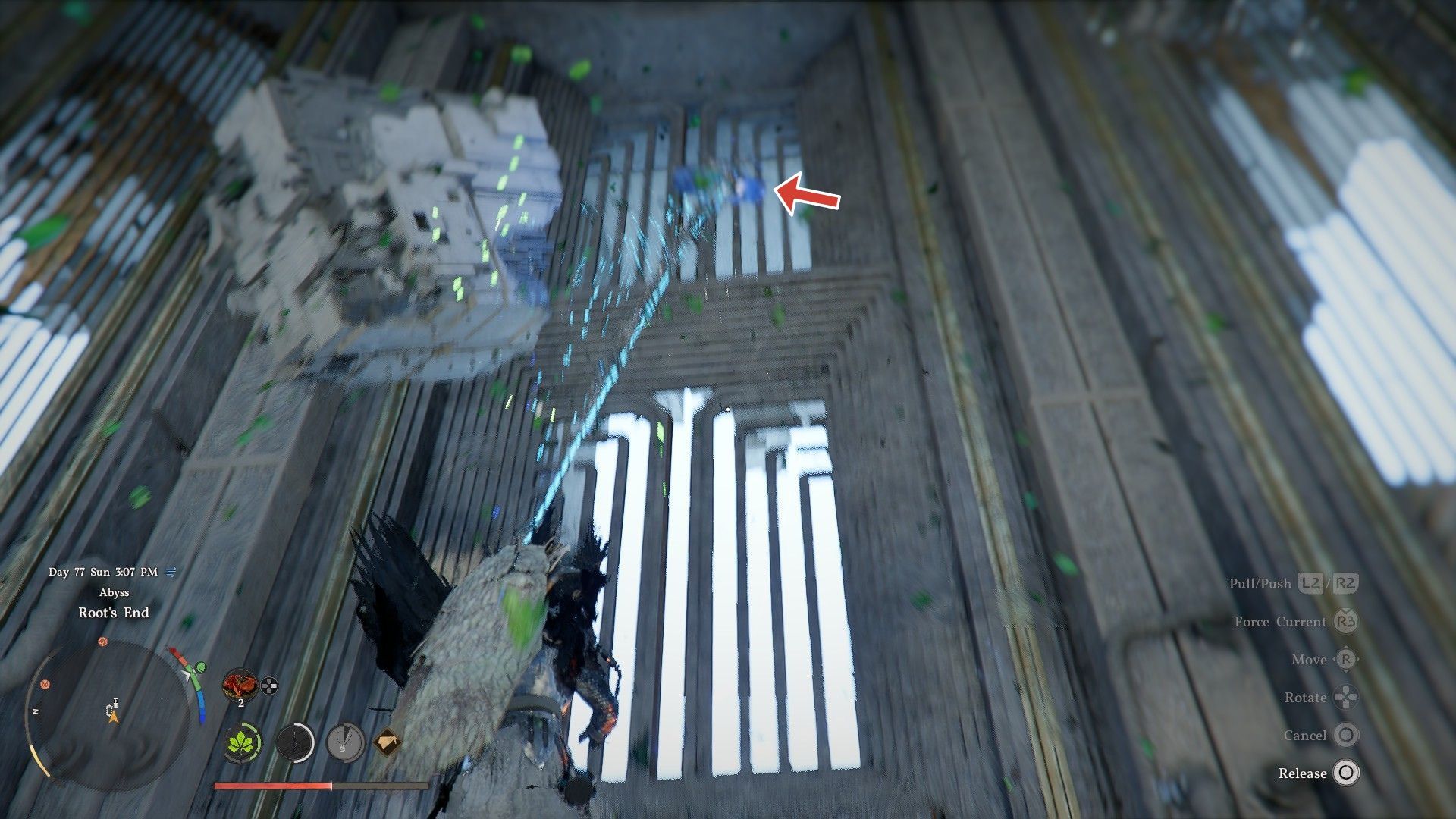 После выхода из Ethereal Pathway следуйте по платформам впереди, пока не увидите большое сооружение, парящее в небе. Это Root’s End. Используйте Force Palm, чтобы подтолкнуть себя вверх и спланировать к нему.