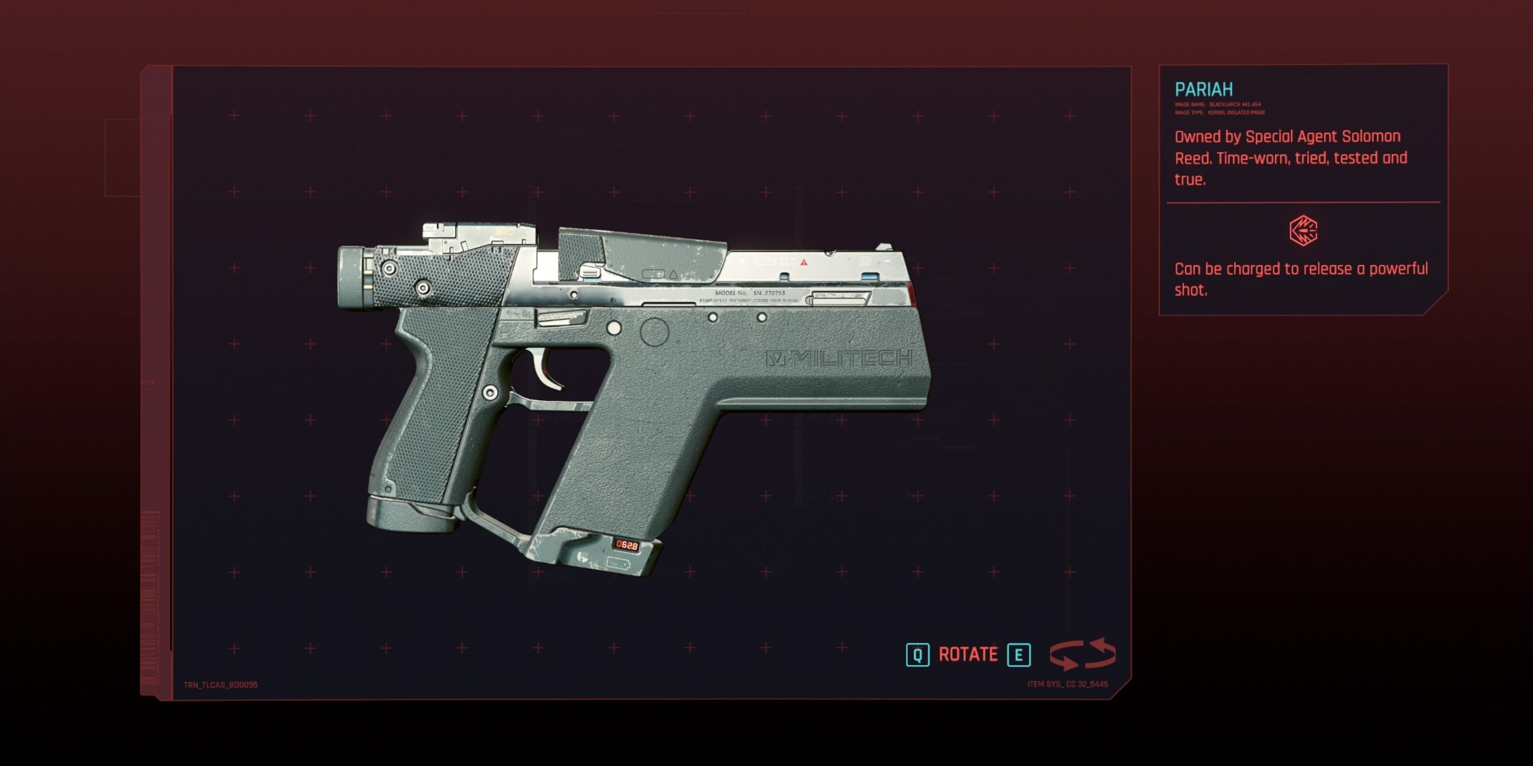 Мудрое решение использовать пистолет «Пария», который дает преимущество в скрытности, но требует гибели Соломона Рида, тем самым завершая содержание Phantom Liberty. «Пария» — стильное оружие, а встроенный глушитель повышает его привлекательность, особенно потому, что каждый заряженный выстрел умножает урон в три раза, что делает бесшумные убийства во время скрытных миссий чрезвычайно смертоносными.