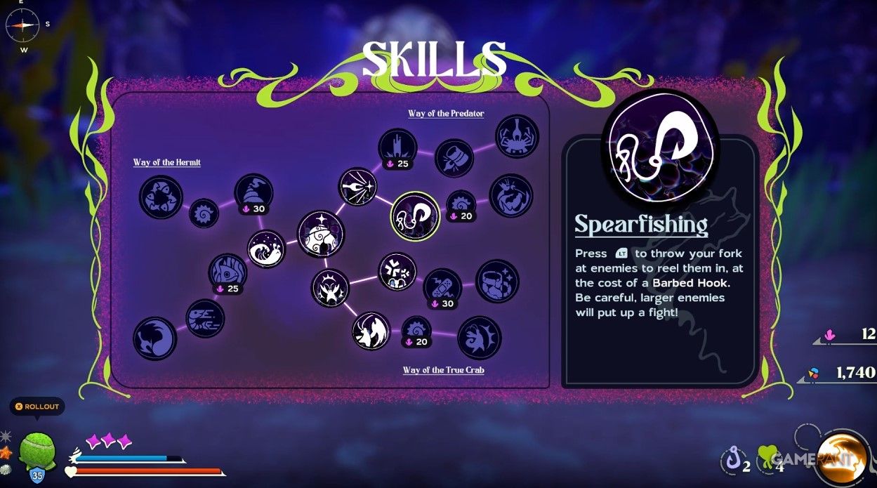 Кажется, что колючие крючки, которые вы накопили за время своего путешествия, можно эффективно использовать только при использовании способности «Подводная охота». Чтобы приобрести новые навыки, отправляйтесь во владения Лунной Улитки и поговорите с живущим там NPC. Для приобретения каждого навыка потребуется потратить 20 кристаллов Умами. Если вам еще не удалось добраться до этого пункта назначения, просто продолжайте продвигаться по повествованию (или обратитесь к этому руководству за помощью по разблокировке навыков и быстрому путешествию).