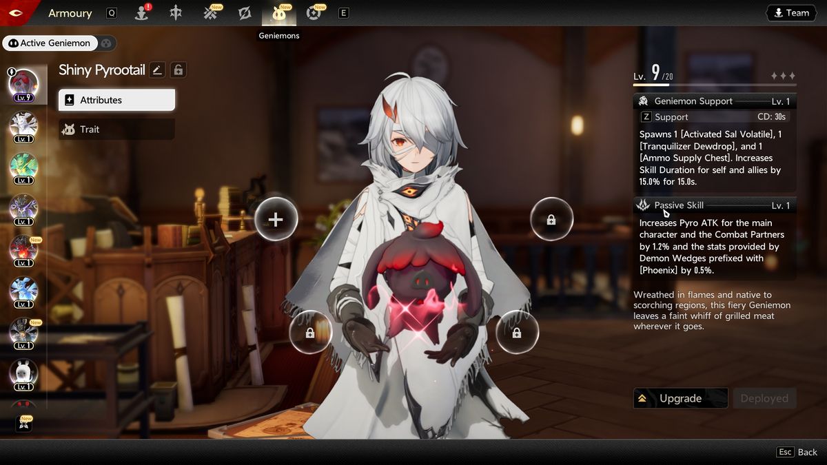 Наконец, есть поддержки Geniemon. Это как экипируемые питомцы, которые дают вам полезные способности, включая пассивные эффекты. Некоторые просто немного увеличивают ваши ресурсы или характеристики, в то время как другие более сфокусированы, например, увеличивают вашу силу огненной атаки. Эти усиления невелики, но они могут суммироваться, когда вы стремитесь к максимальным характеристикам.