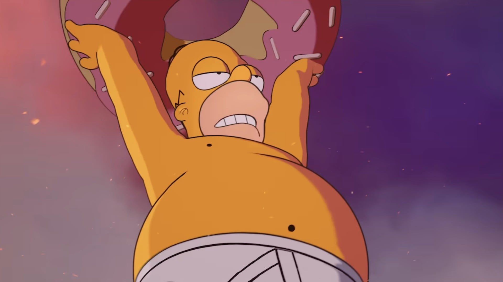 Звёздные истребители X-Wings из Star Wars проносятся по небу, затем в кадр входит огромный Гомер Симпсон, одетый только в своё нижнее белье.