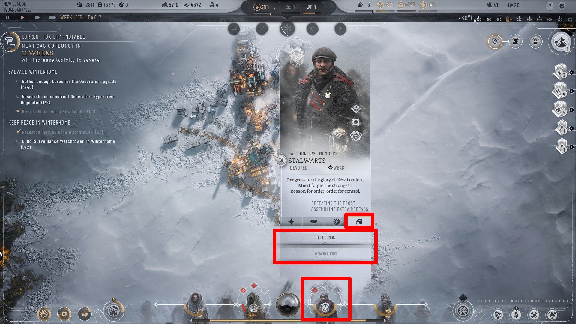 В Frostpunk 2, если у игрока не хватает тепловых марок, он может быстро получить их у доверенного сообщества или фракции, перейдя к ним в нижней части экрана. Для этого просто нажмите вкладку «Одолжения» после выбора Сообщества или Фракции, а затем выберите «Запросить помощь (Сбор средств)» или «Требовать помощь» (Требовать средства).
