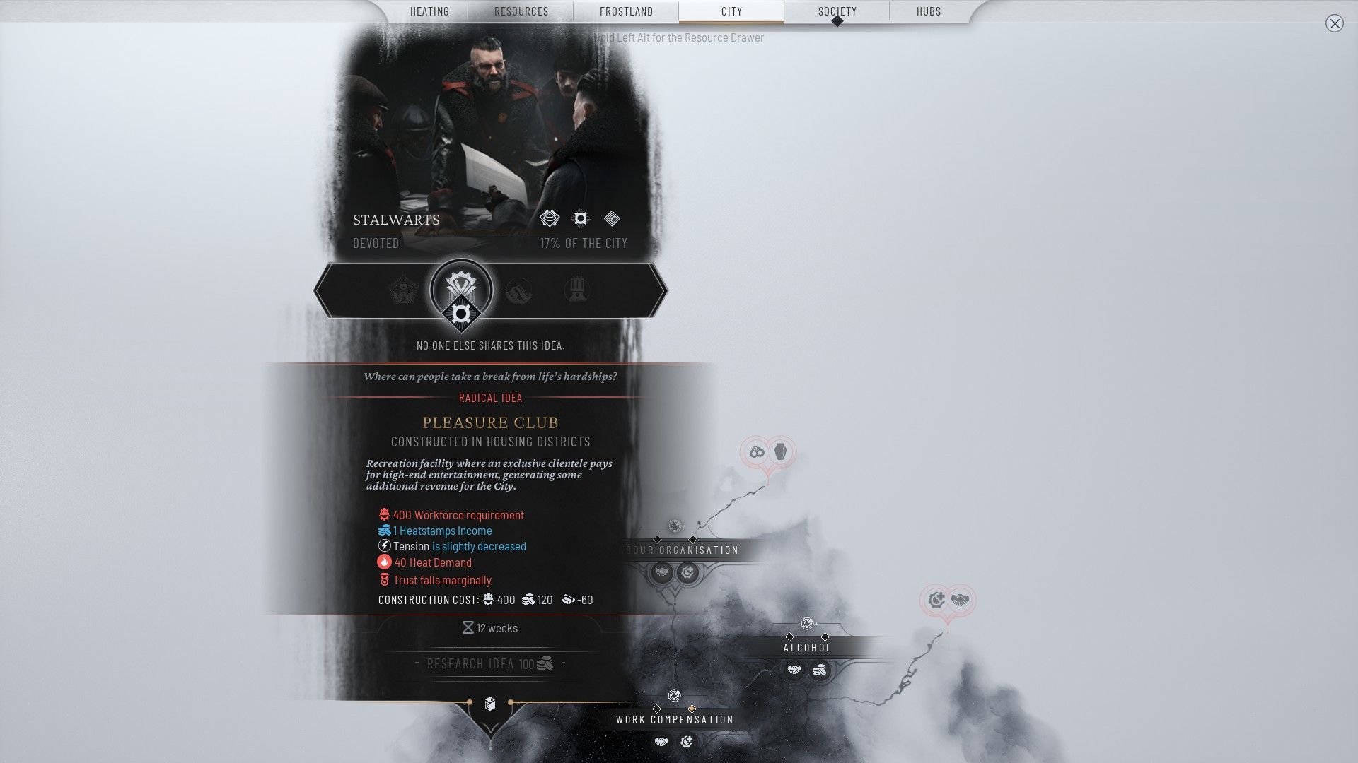 В жилых районах вы можете создавать заведения, известные как Клубы удовольствий, которые могут увеличить ваши доходы от Heatstamp. Однако, чтобы войти в это здание, игрокам необходимо изучить концепцию «Досуг: Клуб развлечений» под Древом идей: Город. Не каждый может иметь доступ к этой идее из-за ее продвинутого характера. На самом деле Клуб Удовольствий — это дальновидная идея, требующая определенного прогресса в Разуме.