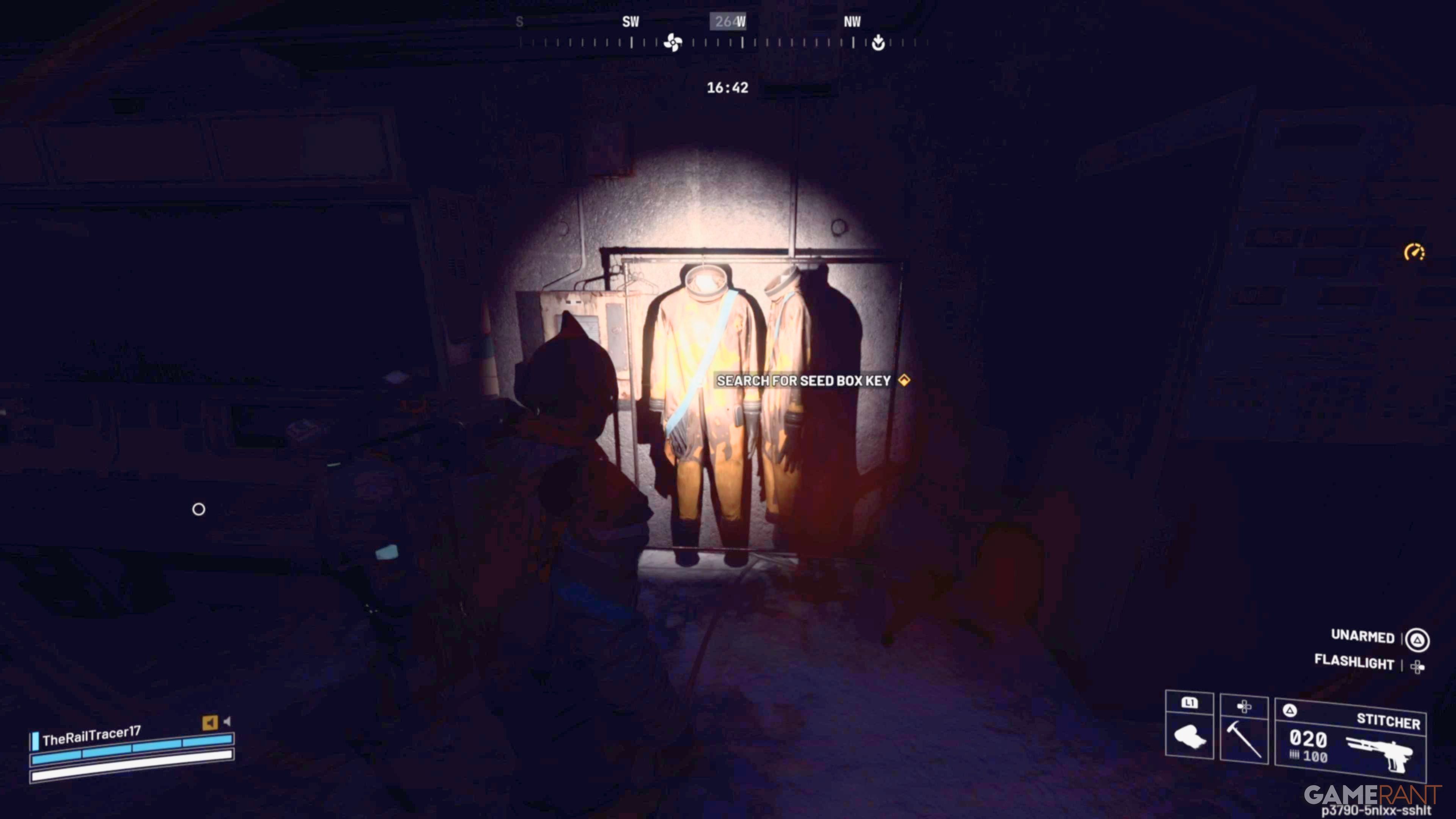 Когда вы доберётесь до Семенного хранилища, поищите журнал исследователя прямо у входа и откройте его – это завершит ваше первое задание. Далее вам нужно найти спрятанный ключ. Идите на запад, затем поверните налево, и вы увидите одежду исследователя. Обыщите её, чтобы получить ключ.
