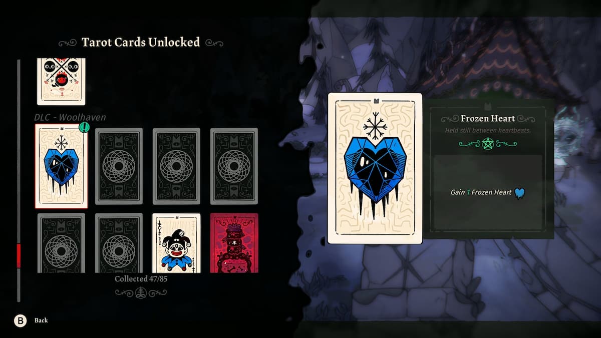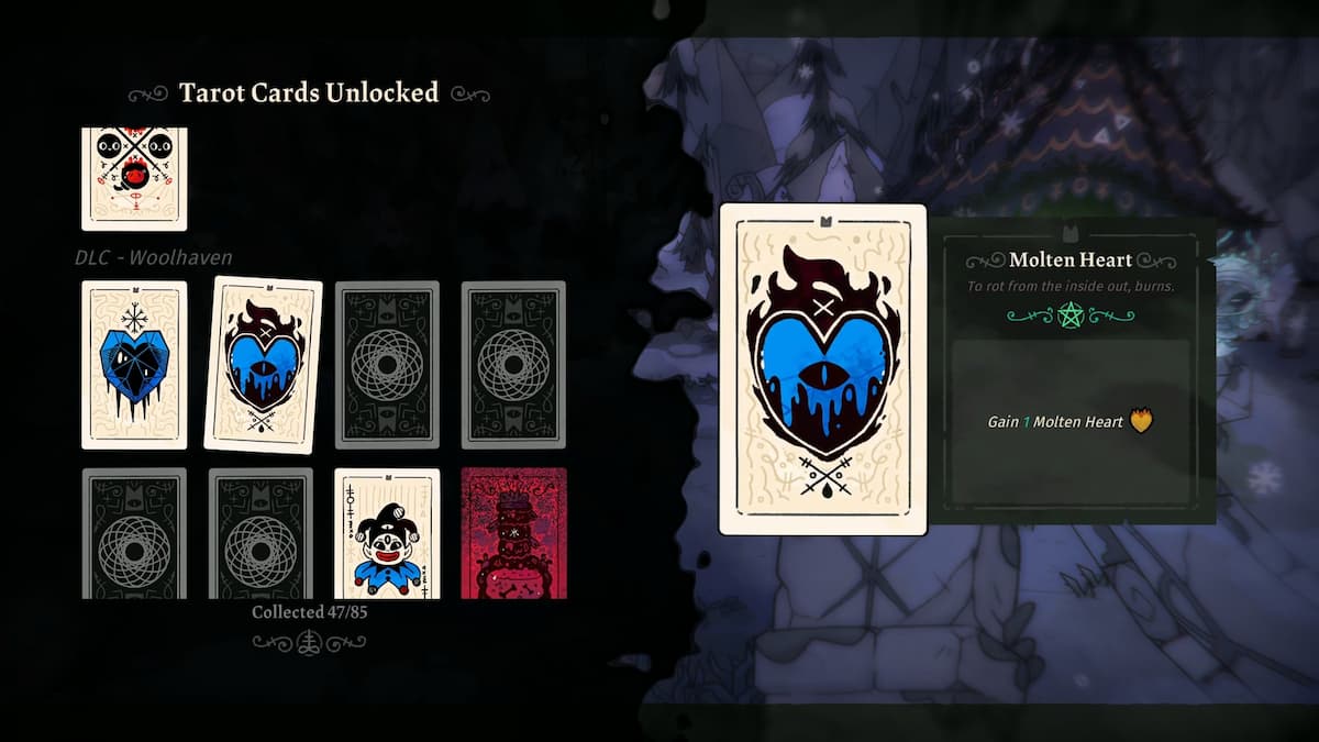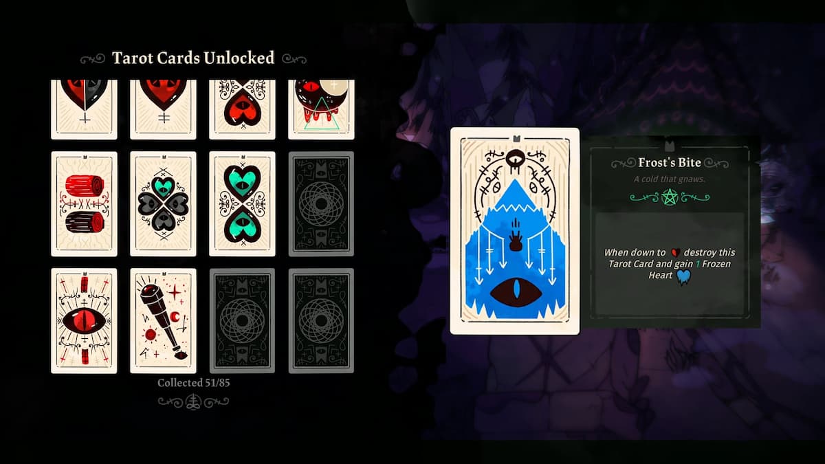 | Укус Мороза | Когда у вас остаётся половина сердца, уничтожьте эту Карту Таро и получите 1 Frozen Heart. | Поиск Азы и Керу в пещере Мидаса. |