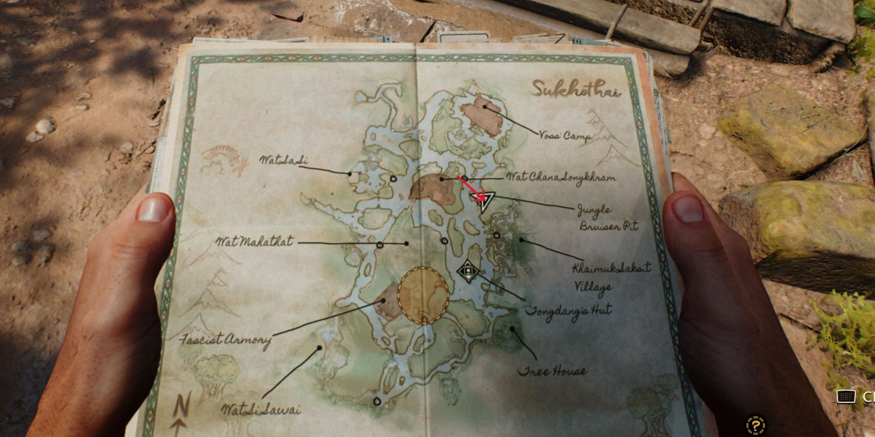 В разделе игры «Сукхотай» вам нужно будет отправиться в лагерь Восса, который расположен на крайнем севере карты и спрятан на территории запрещенного нацистского комплекса. Имейте в виду, что в этом лагере есть несколько зон, поэтому наиболее эффективным маршрутом будет оставаться слева от входа и незаметно перемещаться по грязи и ящикам, пока не дойдете до крайней левой части основного лагеря.