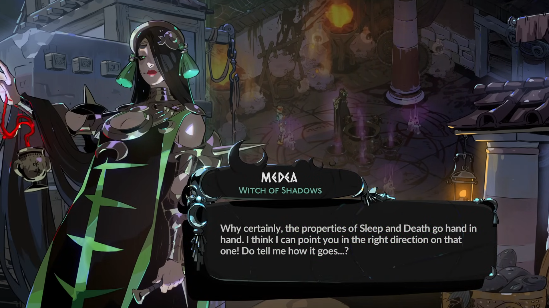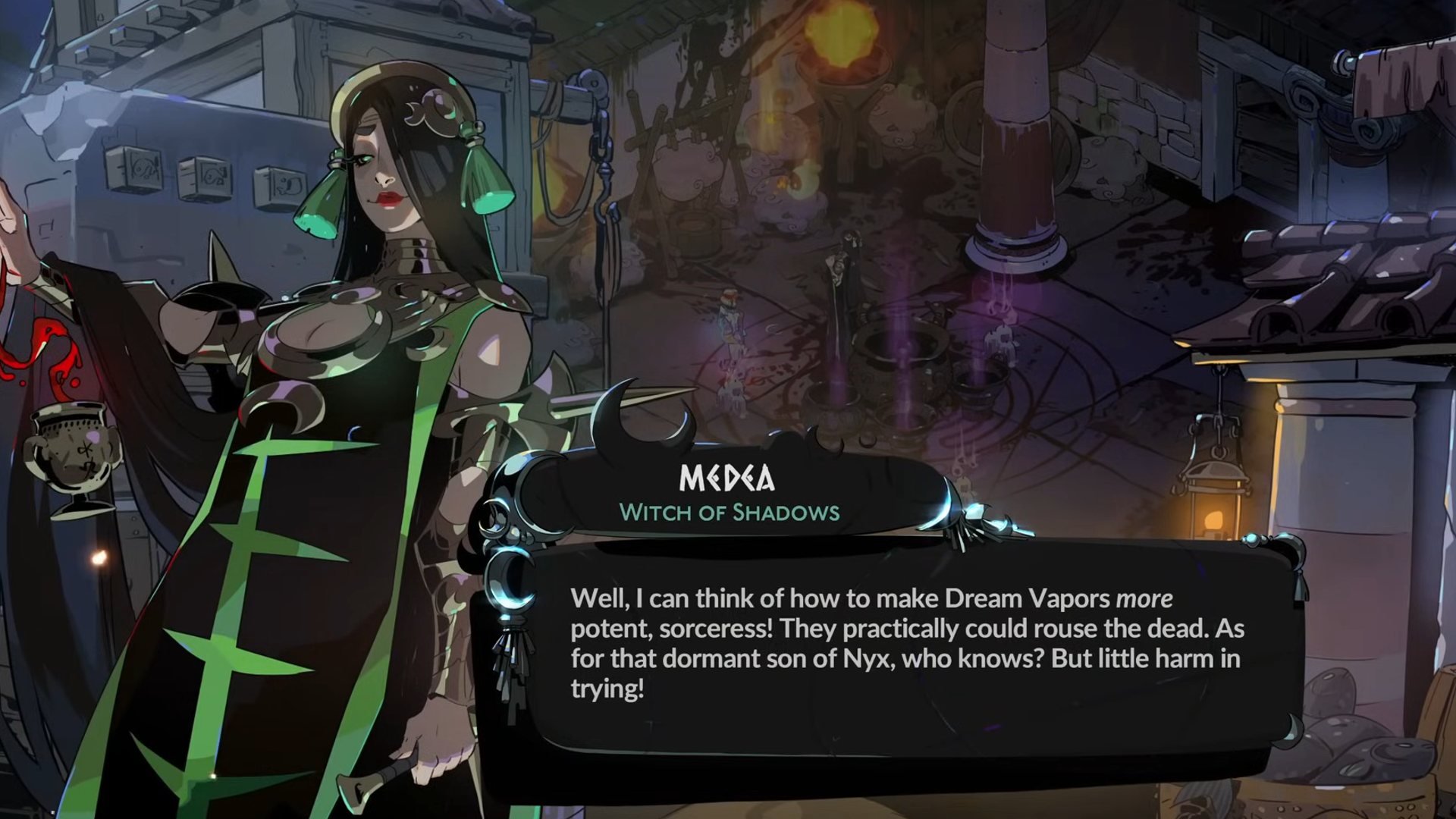 Если обычные Dream Vapors не помогут разбудить Hypnos, нам потребуется более мощное решение. Это означает, что нужно обратиться к Медее, опытной ведьме, специализирующейся на необычной магии. Вы можете найти её в Городе Эфира на поверхности – поищите место, где можно пообщаться с людьми. Возможно, вам придется поговорить с ней несколько раз, прежде чем она появится, но в конце концов она поделится рецептом улучшенного Dream Vapor и заклинанием, необходимым для его создания.