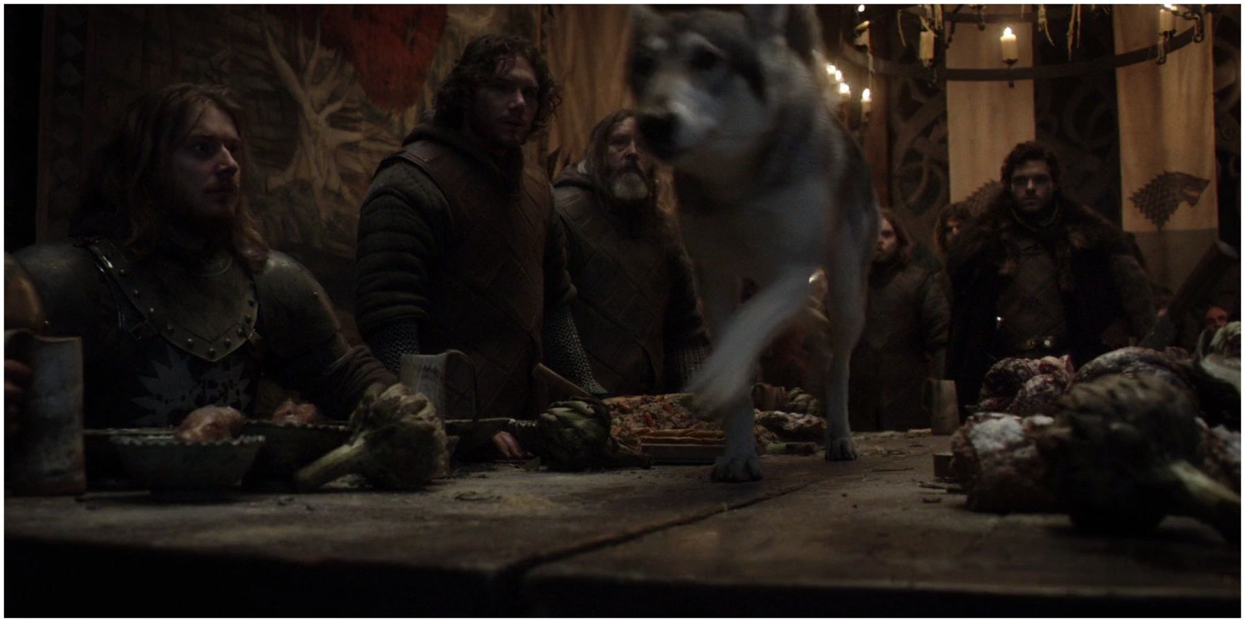 В восьмом эпизоде первого сезона «Игры престолов» под названием «Острый конец» Серый Ветер, лютоволк Робба Старка, неожиданно нападает и калечит Грейтджона Амбера. Это происходит без какого-либо предупреждения Робба. Серый Ветер взволнован суматохой и быстро вмешивается, чтобы защитить, демонстрируя свои проницательные инстинкты животного с большим интеллектом.