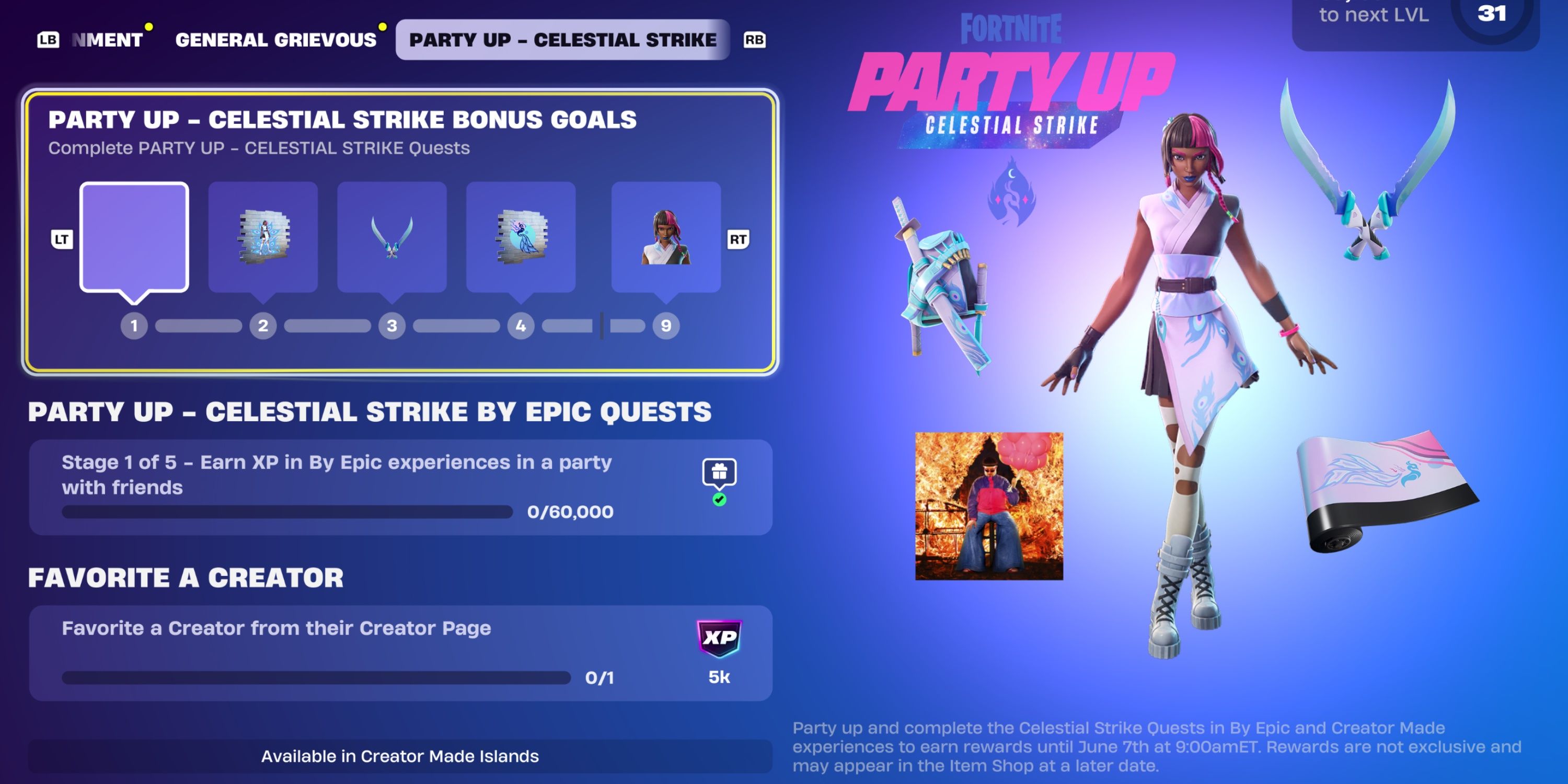 Чтобы получить доступ к Ириде Вайн в ‘Fortnite’, игрокам необходимо выполнить девять заданий Celestial Strike Quests. Во время этого события есть две повторяемые задачи: одна требует совместной игры с другом в любом официальном режиме ‘Fortnite’, таком как Battle Royale, Fortnite Festival, Rocket Racing, LEGO Fortnite Odyssey или Brick Life; другая может быть выполнена путём участия в режимах Creator Made experiences, то есть на любых креативных картах, созданных не компанией Epic.
