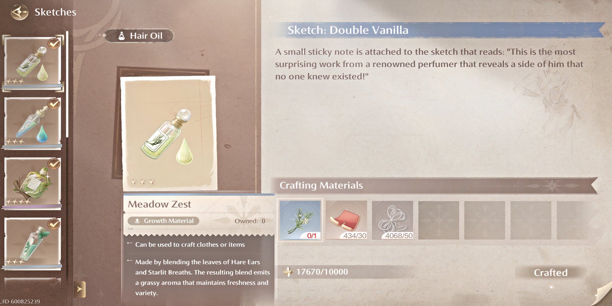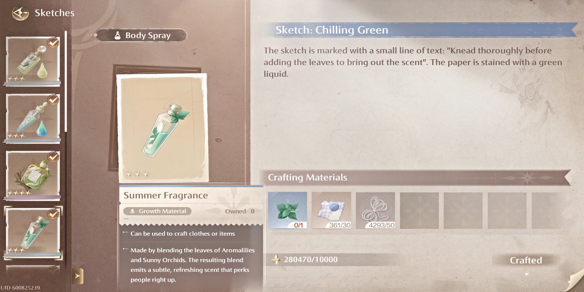 Формула аромата имеет тенденцию быть довольно краткой. Помимо материала роста, он обычно требует конкретного материала сущности, пряди чистоты и различных количеств блеска. При создании аромата он становится постоянно доступным для вашего персонажа, и вы можете оборудовать его в любое время через меню гардероба.