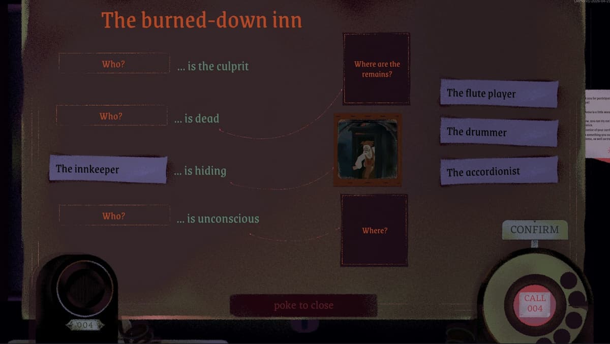 Первая часть игры достаточно проста, но тайна, связанная со сгоревшей гостиницей и музыкантами, – это то, где она действительно становится захватывающей. Она заставила меня внимательно анализировать всё, что я находил, изучать улики и решать головоломку. То, как игра представляет информацию, кажется естественным и интерактивным, почти как будто вы напрямую работаете с предметами. Завершённая версия обещает ещё больше развить этот захватывающий опыт.