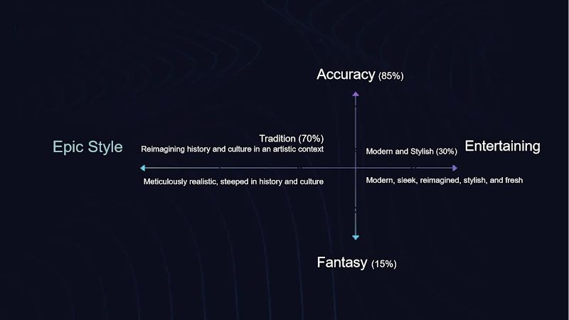 Изначально мы тщательно выбирали художественный подход, стремясь к сочетанию, которое на 85% основано на исторической правде и на 70% грандиозно по своей эпичности. Однако важно отметить, что эти проценты не точны; вместо этого они служат руководством, помогающим нам поддерживать желаемый баланс аутентичности и величия на протяжении всей нашей работы.