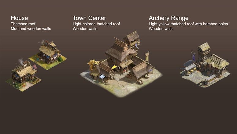 В нашем подходе мы уделяем большое внимание исторической точности, но были готовы внести коррективы, чтобы обеспечить плавный игровой процесс. Чтобы создать ощущение глубины, мы максимально тщательно разбили цивилизации во времени. Например, в случае с Японией мы определили важные эпохи и использовали архитектурные проекты этих периодов. Затем мы выделили отличительные материалы и стили. В феодальной Японии мы связывали архитектурный стиль с периодами Аска, Нара и Хэйан, как и раньше, уделяя особое внимание таким сырьевым материалам, как грязь и дерево. Тип построек различался в зависимости от их функции; жилые дома обычно имели глиняные и деревянные стены и соломенные крыши, в то время как важные постройки, такие как центры городов, имели деревянные стены.