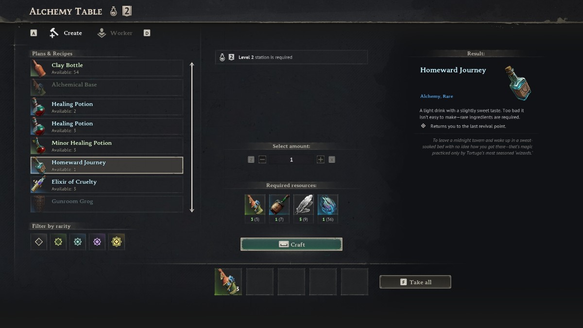 Окей, так добывать ингредиенты для зелий может быть немного сложно! Я выяснил, что Алхимическую Базу можно создать, изготавливая Глиняные Бутылки за Алхимическим Столом. Ромовые Бутылки? Они сложнее. Я нашёл их в этих маленьких лагерях моряков, и вы фактически получаете одну во время основного квеста, когда спасаете моряков для своей команды. Перья добываются из этих Лазурных Додо, а Нежити Эссенция выпадает из этих жутких Утопленников, которые появляются только ночью – плюс, некоторые квесты, такие как ‘Fifteen Men’ и ‘Dead Man’s Chest’, тоже дают вам их. Рецепт того, что вы пытаетесь сделать, должен появиться, как только вы подберёте хотя бы по одному из этих предметов, за исключением самой Алхимической Базы.