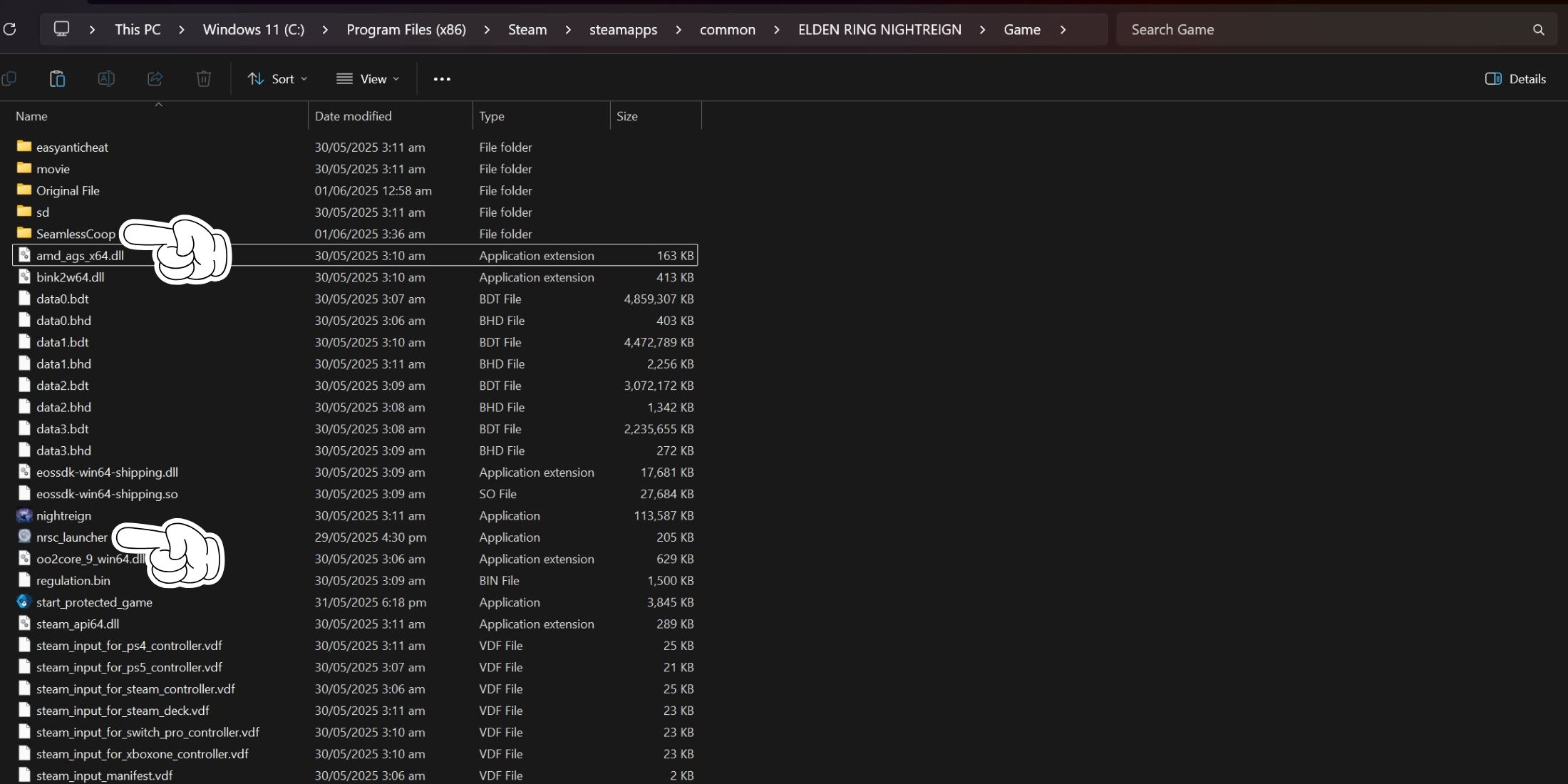 2. После того как файлы загружены, распакуйте их в каталог игры, где находится основной файл EXE. По умолчанию этот каталог должен располагаться по пути «C:\Program Files (x86)\Steam\steamapps\common\ELDEN RING NIGHTRING\Game».