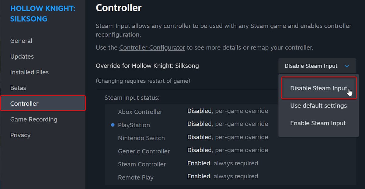 - На вкладке «Контроллер» выберите опцию «Отключить ввод Steam» в разделе «Переопределение для Hollow Knight: Silksong».