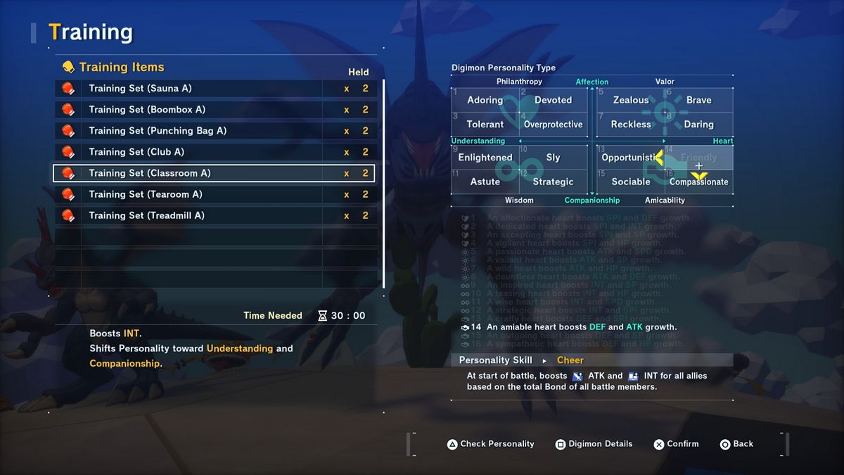 Предоставление им пищи укрепляет вашу связь, а тренировки помогают улучшить их способности. Помимо повышения способностей, тренировки также могут повлиять на их личность. Вы будете получать Наборы тренировок, каждый из которых улучшает конкретную способность и также корректирует их личность в сторону одного из четырех основных качеств (это не касается их основной личности).