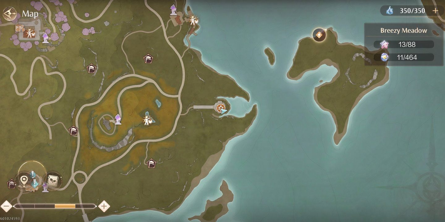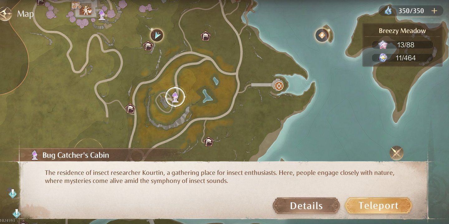 Прежде чем отправиться в Лебединую беседку за Whimstar, вам следует сначала определить ее конкретное местоположение на Ветреном лугу. Начните с навигации к варп-шпилю «Хижины ловца жуков», который изображен на первом представленном изображении карты. Эту достопримечательность можно найти к юго-западу от Флоравиша.