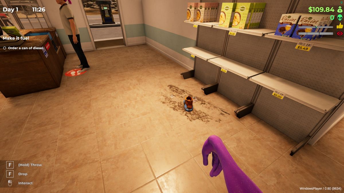 Окей, мне нужно прибрать этот беспорядок! Я беру эту губку в форме туфли из ванной комнаты – это мой инструмент для уборки. Затем я просто удерживаю левую кнопку мыши и провожу ею по всему, что нужно очистить, пока всё не заблестит. Она даже работает с этим странным запахом, который немного отвратителен. Чтобы избавиться от запаха, мне нужно протереть либо туалеты, либо пол под машинами у бензоколонки. Понял, давайте приступать к уборке!