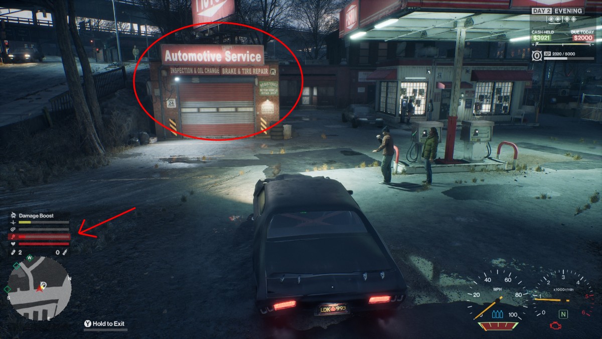 Как только вы найдёте автомастерскую, обратите внимание на большую вывеску с надписью «Automotive Service». Вы увидите гаражные ворота, которые автоматически откроются, когда вы подъедете. Заедьте внутрь, и должно появиться сообщение с вопросом, хотите ли вы ремонт или заправку нитро.