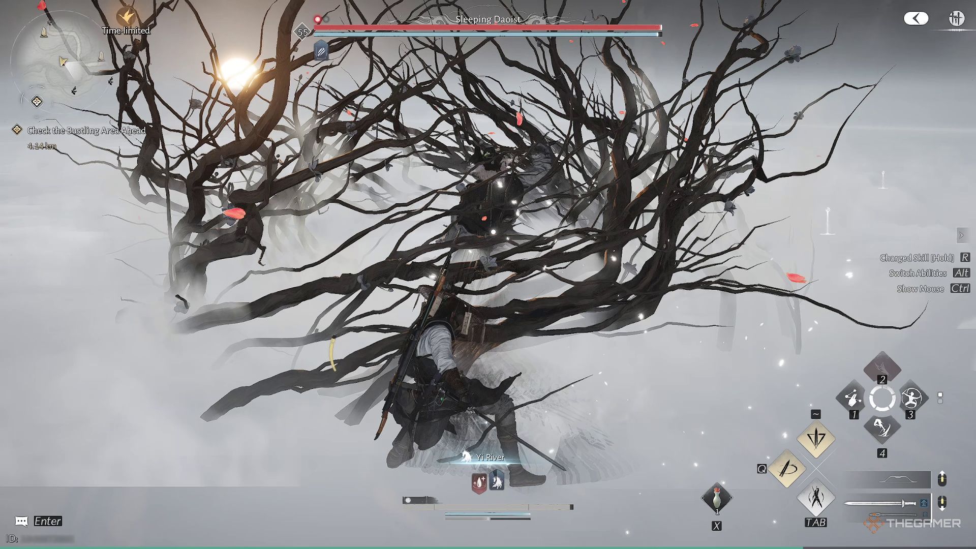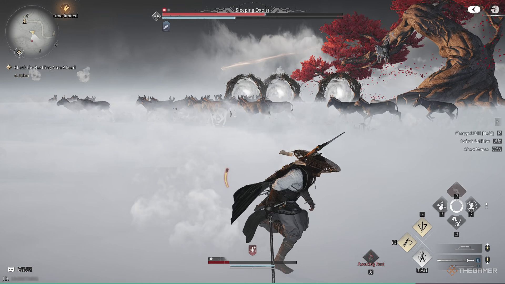 Окей, так сражаться со Спящим Даосом довольно интересно! Он кидает в вас кучу всего – в основном белые снаряды, которые создаёт, размахивая своим оружием. Но дело не только в нём, в бой вступает и его ослик, прыгающий и бьющий копытами! Обычно он выпускает от двух до четырёх таких снарядов подряд, поэтому нужно следить за очередями атак. Это довольно визуально насыщенный бой со всеми летающими снарядами.