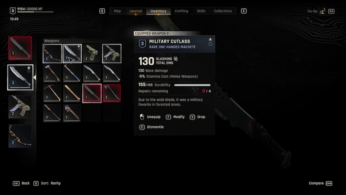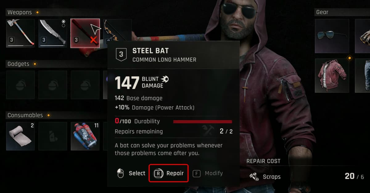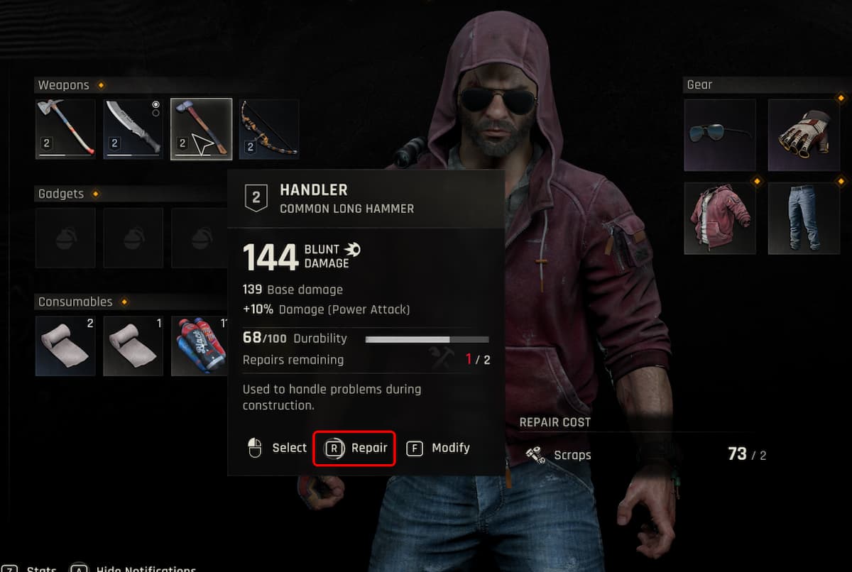 Оружие в Dying Light: The Beast изнашивается по мере использования. Чтобы его починить, откройте инвентарь и наведите курсор на оружие, которое хотите восстановить. Затем нажмите и удерживайте клавишу ‘R’, чтобы восстановить его прочность, используя при этом часть собранного хлама.