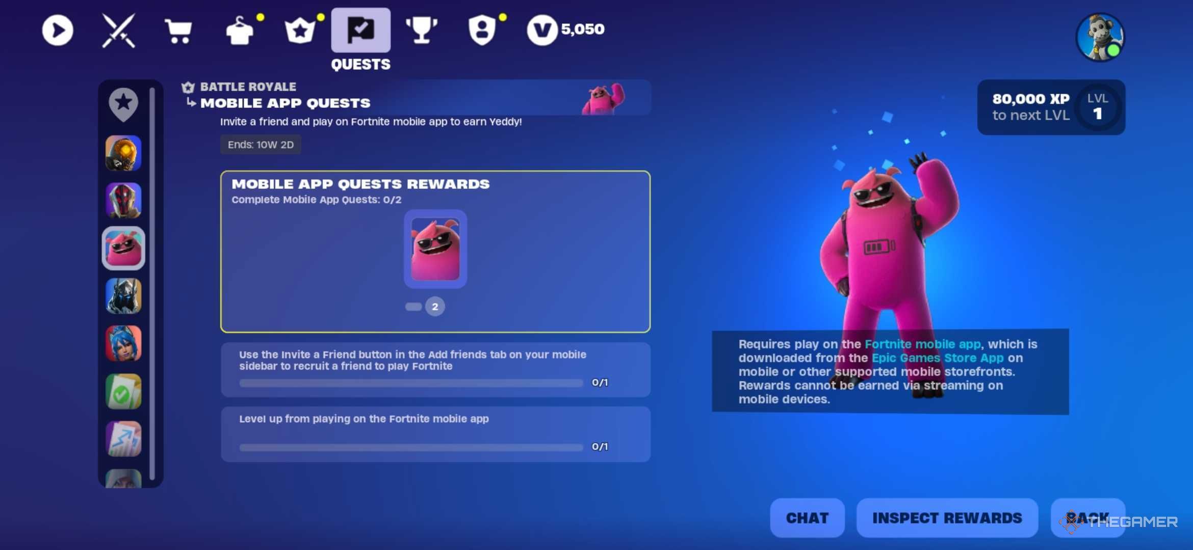 | Используйте кнопку «Пригласить друга» во вкладке «Добавить друзей» на боковой панели вашего мобильного устройства, чтобы пригласить друга поиграть в Fortnite. | Это ставит в тупик некоторых игроков: речь не о приглашении одного из ваших Fortnite друзей в группу, а о приглашении друга поиграть в Fortnite. Вы можете сделать это, открыв боковую панель/настройки и выбрав вкладку с иконкой человека и знаком плюс. Нажмите ‘Пригласить друга’, и откроются способы приглашения людей другими способами, но вам на самом деле не нужно никого приглашать. Простое нажатие на кнопку даст сигнал игре, что вы это сделали, и завершит квест за вас. |