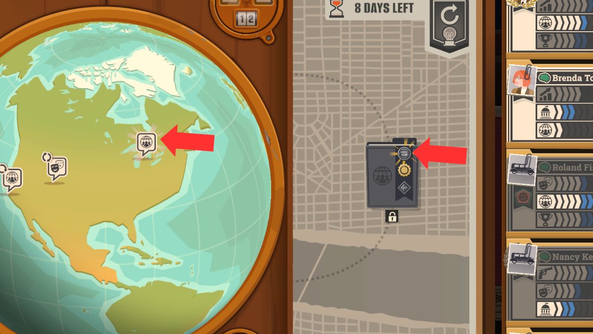 Сначала выберите свой район, нажав на «select district», а затем начинайте свой день. Обратите пристальное внимание на карту мира — новая информация, называемая «scoops», будет появляться случайным образом. Эти scoops легко заметить, потому что они имеют заметное свечение. Нажатие на scoop раскроет конкретный предмет, к которому он относится, как вы можете видеть на следующем изображении.