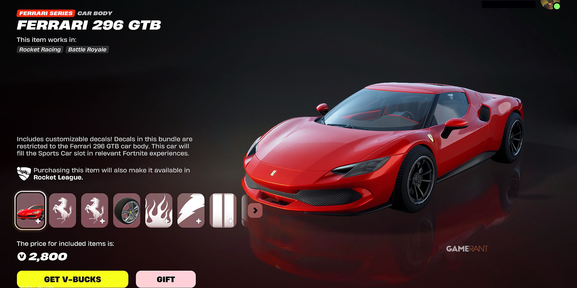 В игре Rocket League вы можете приобрести Ferrari 296 GTB за 2800 кредитов, так что вопрос о том, в какой именно игре игроки решат это сделать, не имеет большого значения. Кроме того, предметы, приобретаемые в Rocket League, будут похожи на те, что можно найти в Fortnite, но без наклеек Flame, Lightning, Stripe и Wings.