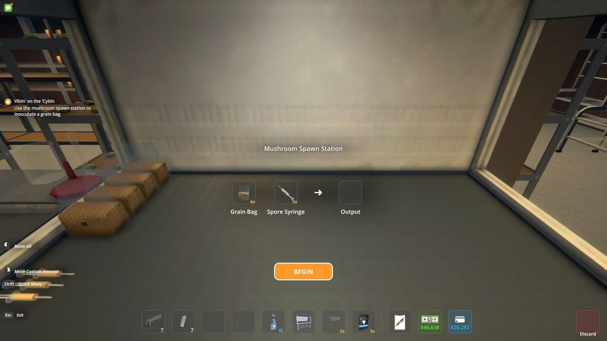 Чтобы начать, используйте Mushroom Spawn Station и добавьте как Grain Bag, так и Spore Syringe. Сначала снимите крышку с Spore Syringe и введите его содержимое в Grain Bag через чёрное квадратное отверстие. Вы можете наклонять шприц, нажимая клавиши «A» и «D».