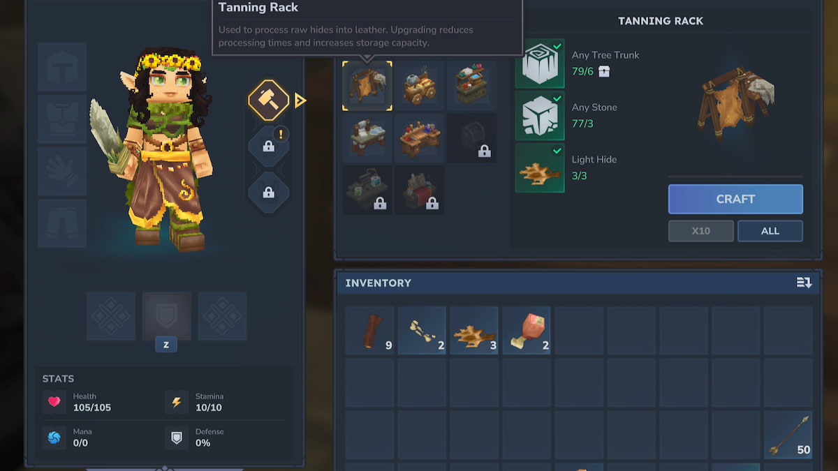 Создание различных типов Кожи включает в себя победу над конкретными существами для сбора необходимых материалов. Сначала вам нужно будет построить Верстак для дубления – это одна из станций крафта, доступных в игре.