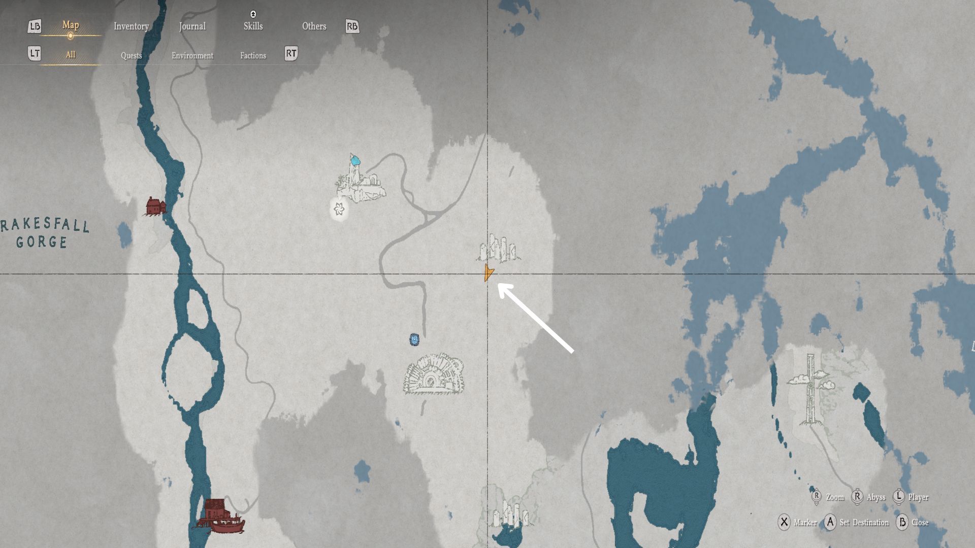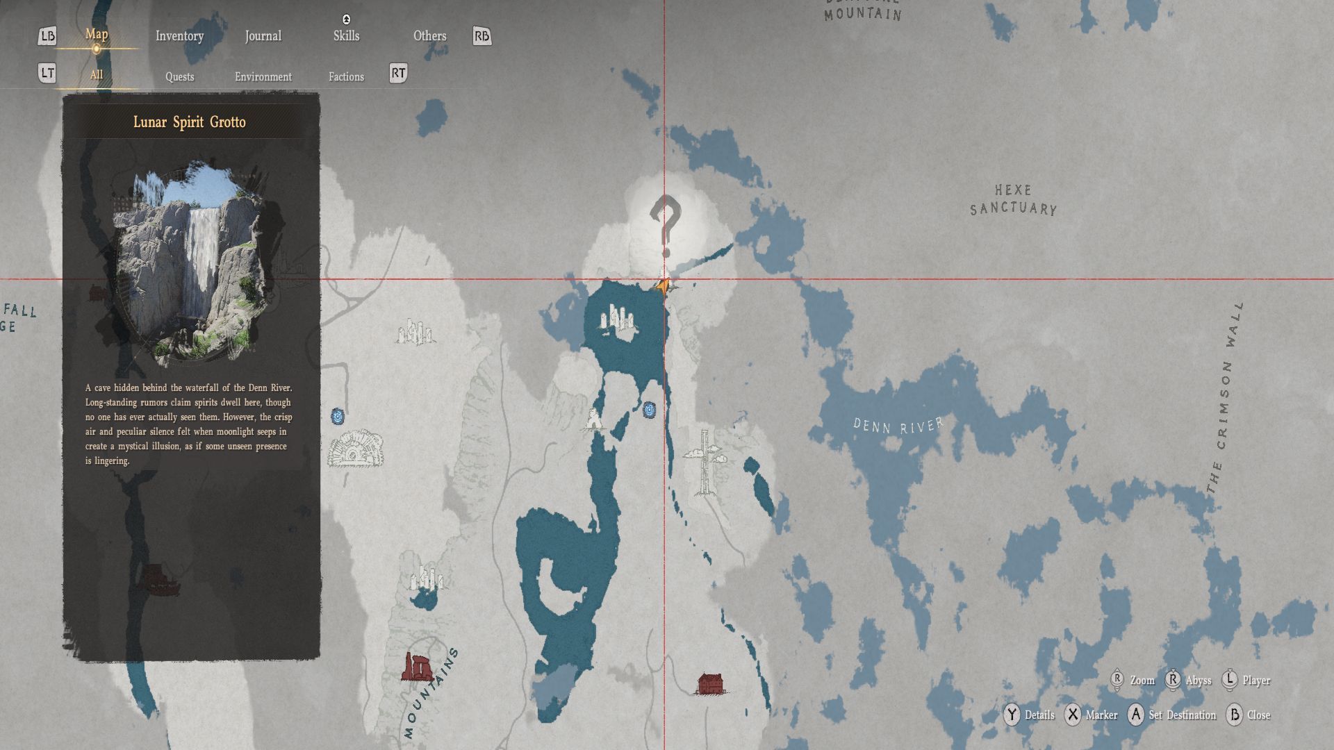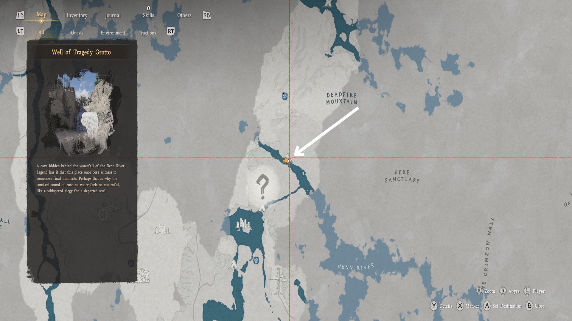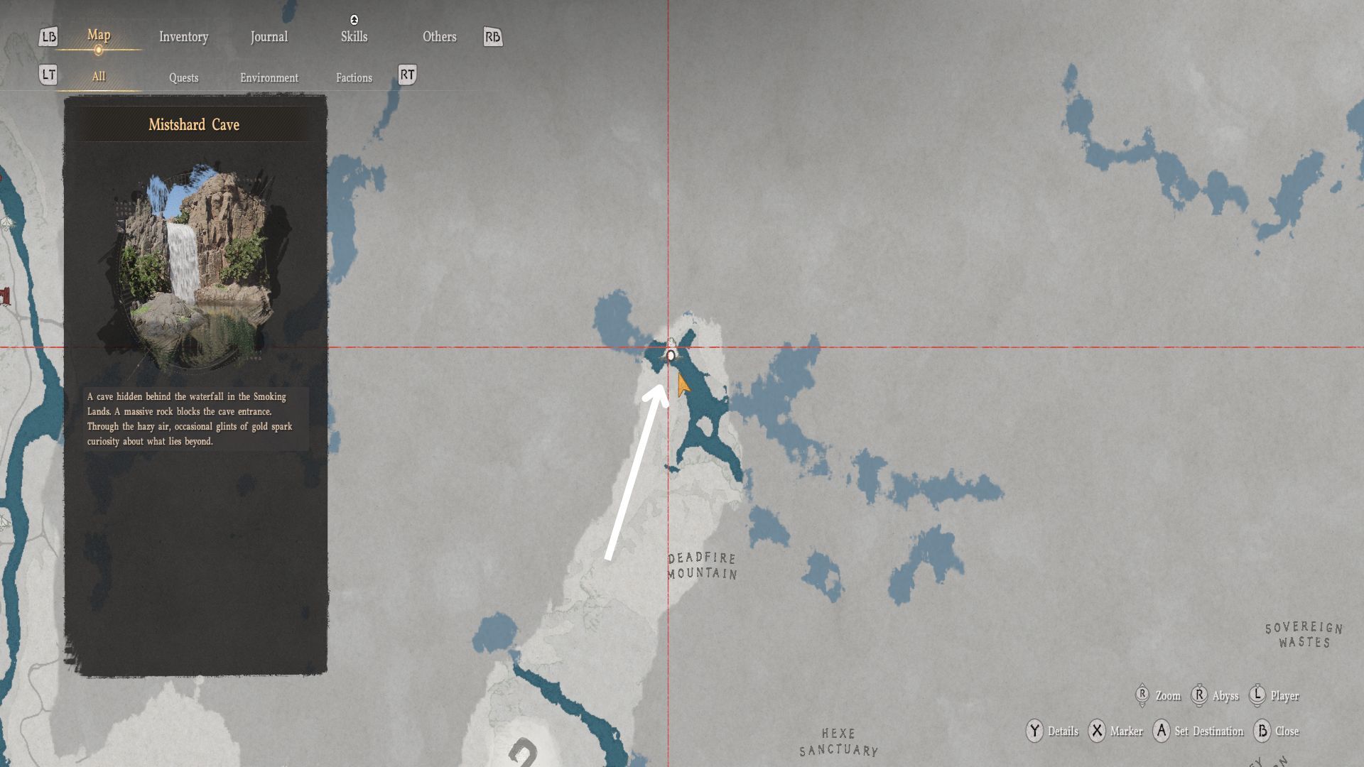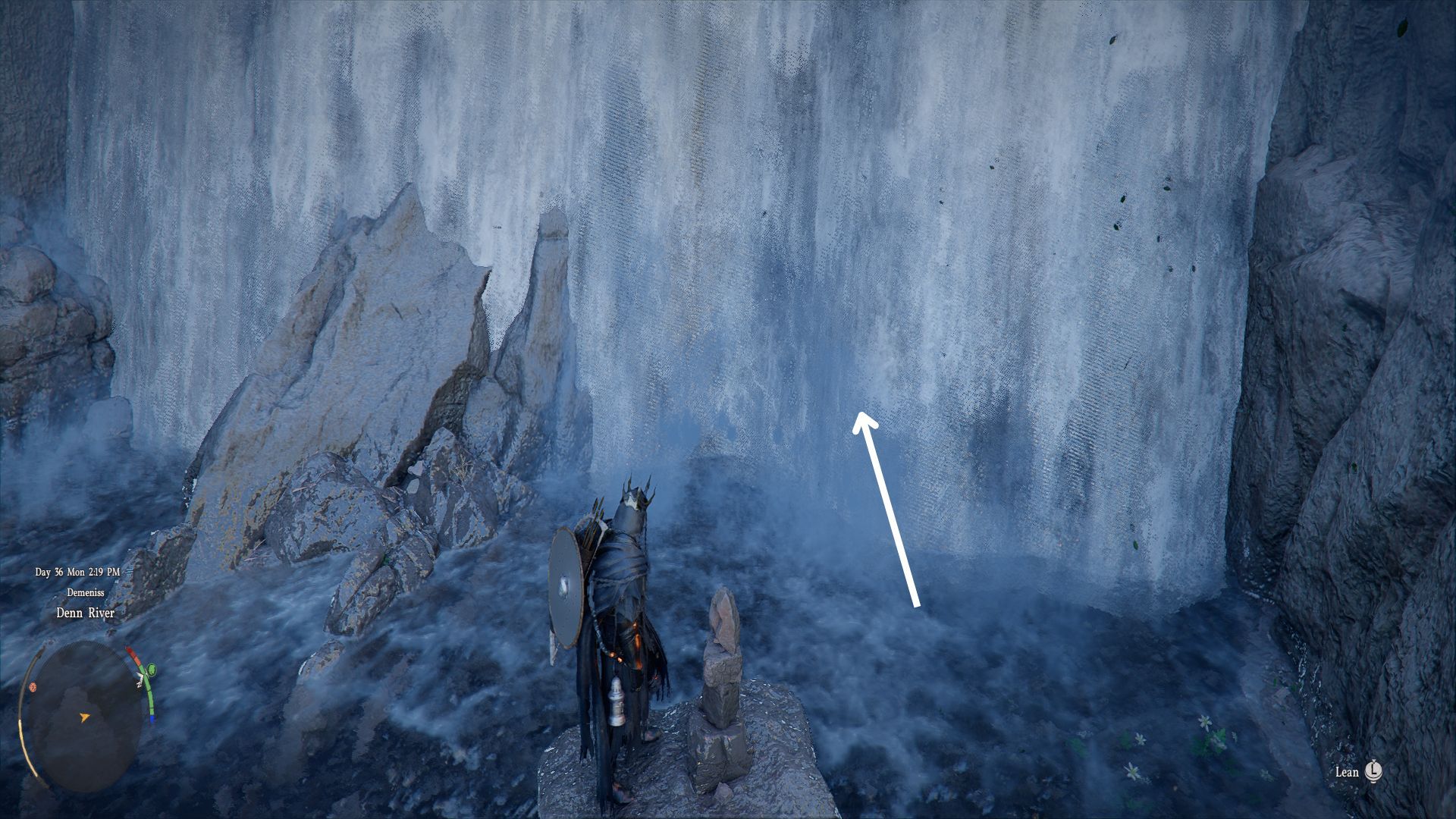 Отправляйтесь в указанное на карте место и найдите водопад, изображенный на картинке. Чтобы пройти за водопад, экипируйте меч и используйте пронзающую атаку, чтобы пробить водяную завесу.