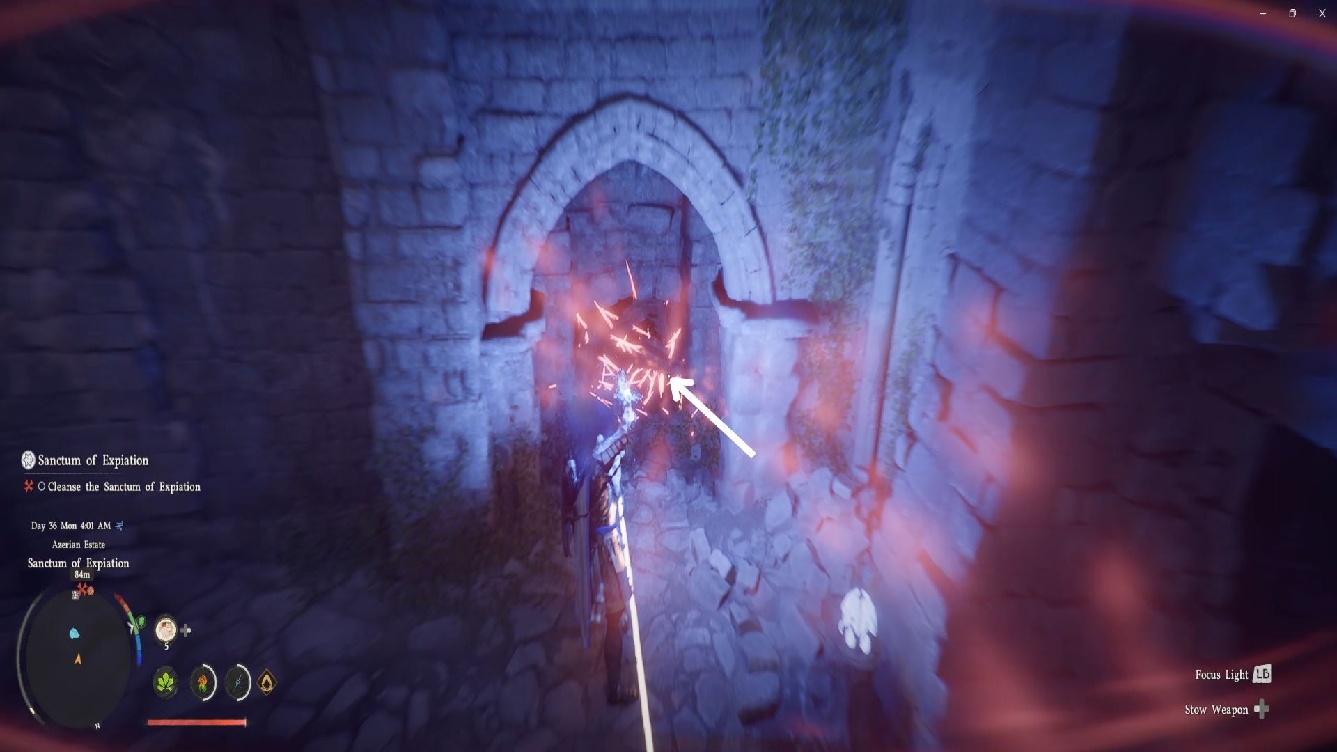 После того, как вы найдёте вход, используйте свой ослепляющий свет, чтобы уничтожить лианы, которые преграждают путь, как показано на изображении.