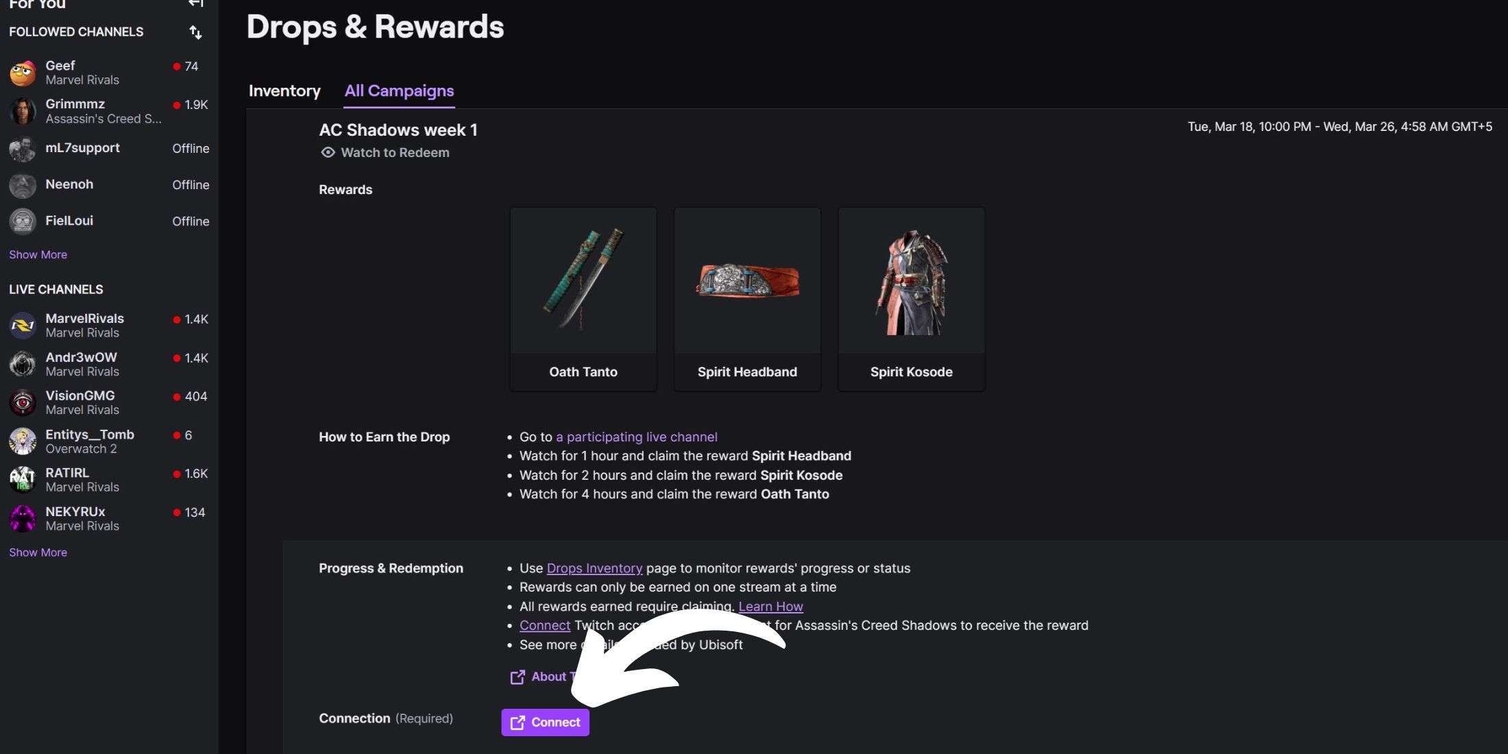 - Когда прогресс будет завершен, вернитесь на страницу Twitch Drops в разделе «AC Shadows» и нажмите обновить рядом с кнопкой Подключиться.