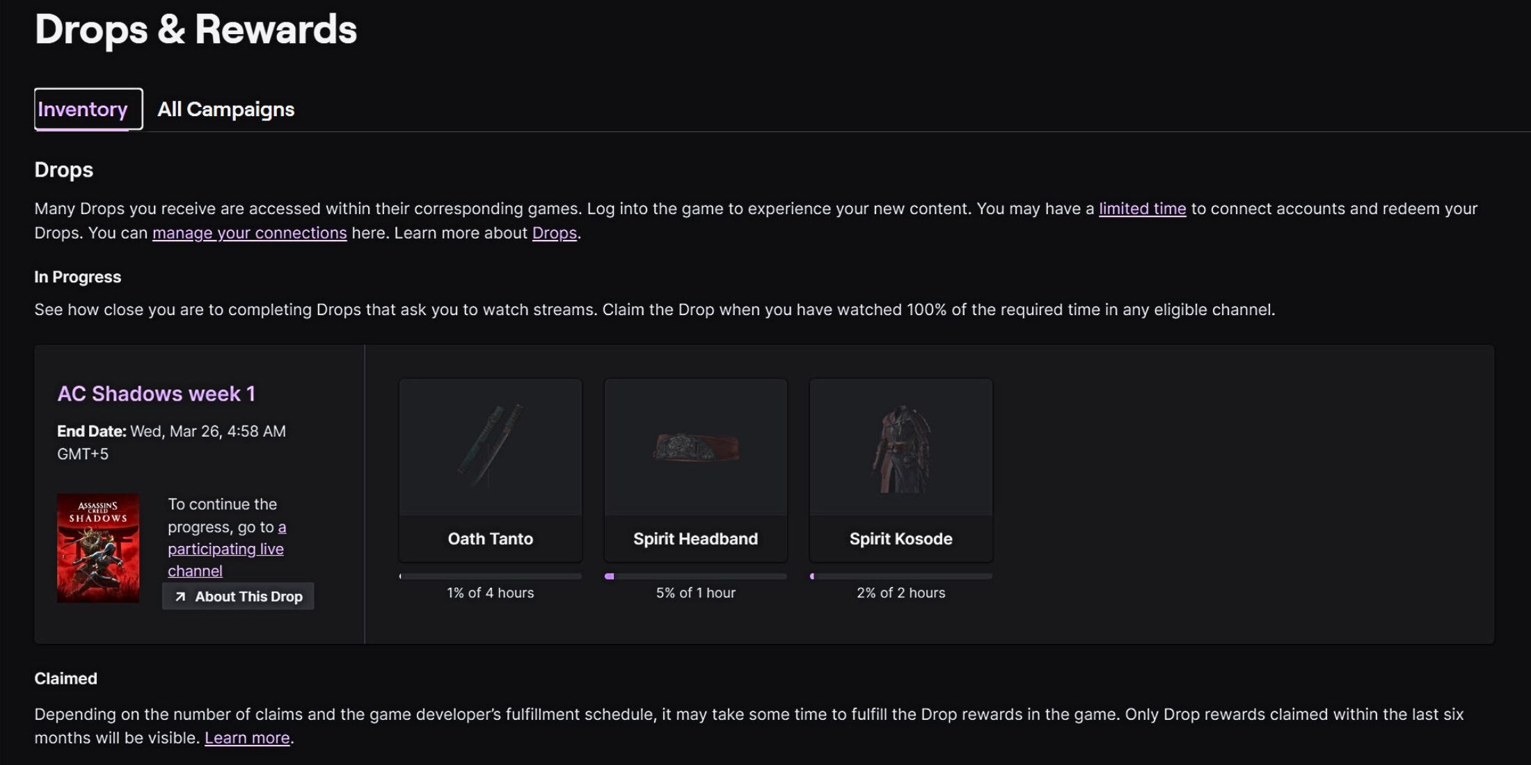 Для отслеживания прогресса ваших наград перейдите в раздел Inventory на Twitch. Когда бары прогресса достигнут 100%, вы сможете обменять и использовать их в игре Assassin’s Creed Shadows.