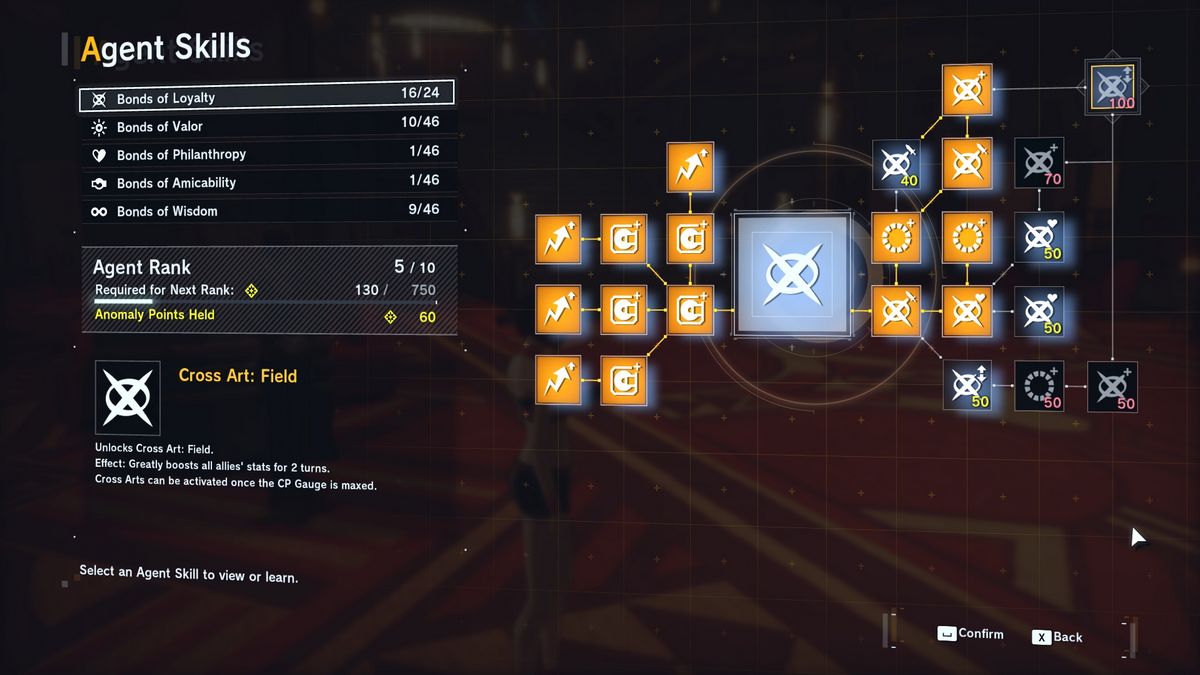 Используйте любые Очко Аномалии, которые вы заработали, чтобы улучшить свои навыки и повысить ранг Агента. Я рекомендую сосредоточиться на узлах опыта или повышения уровня в дереве «Узы Верности» (левая сторона); они постоянно полезны, особенно при повышении уровня ваших Дигимонов. Ознакомьтесь с деревом «Узы» для получения более подробной информации.