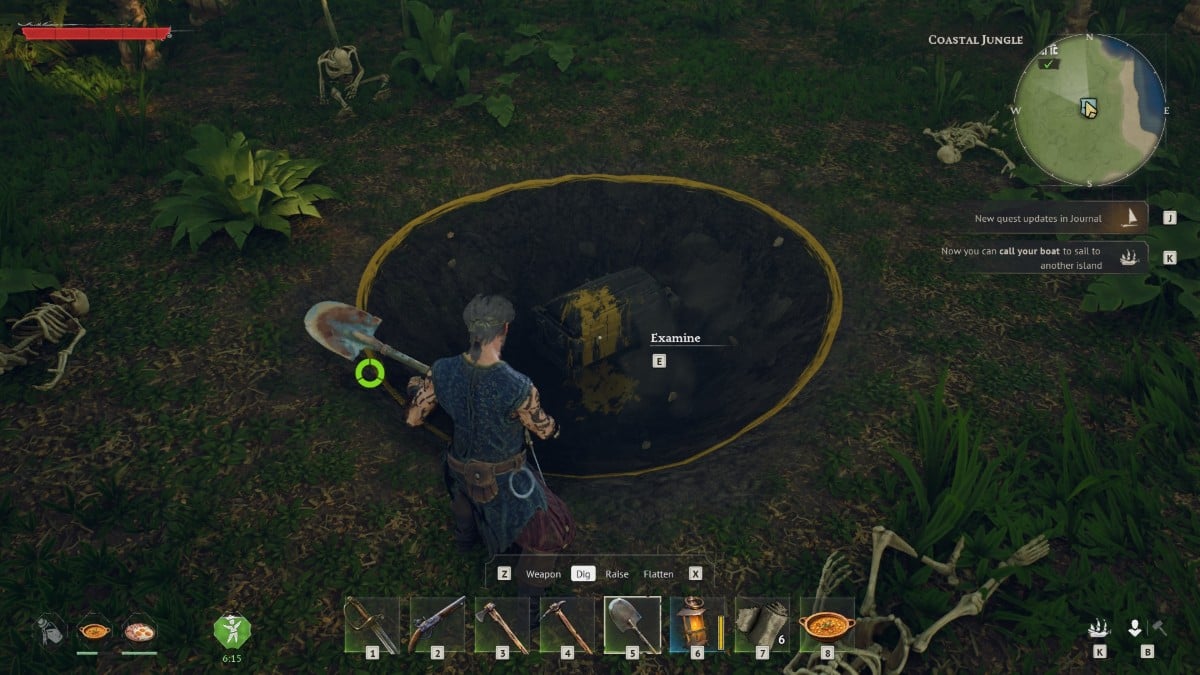 По мере приближения к области для квеста «Пятнадцать человек на сундуке мертвеца», вы заметите несколько скелетов, разбросанных вокруг. Сундук с сокровищами не виден сразу; вам понадобится инструмент, чтобы его найти. Пираты часто закапывают свои сокровища, и в этом квесте оно спрятано под землей среди останков экипажа корабля.