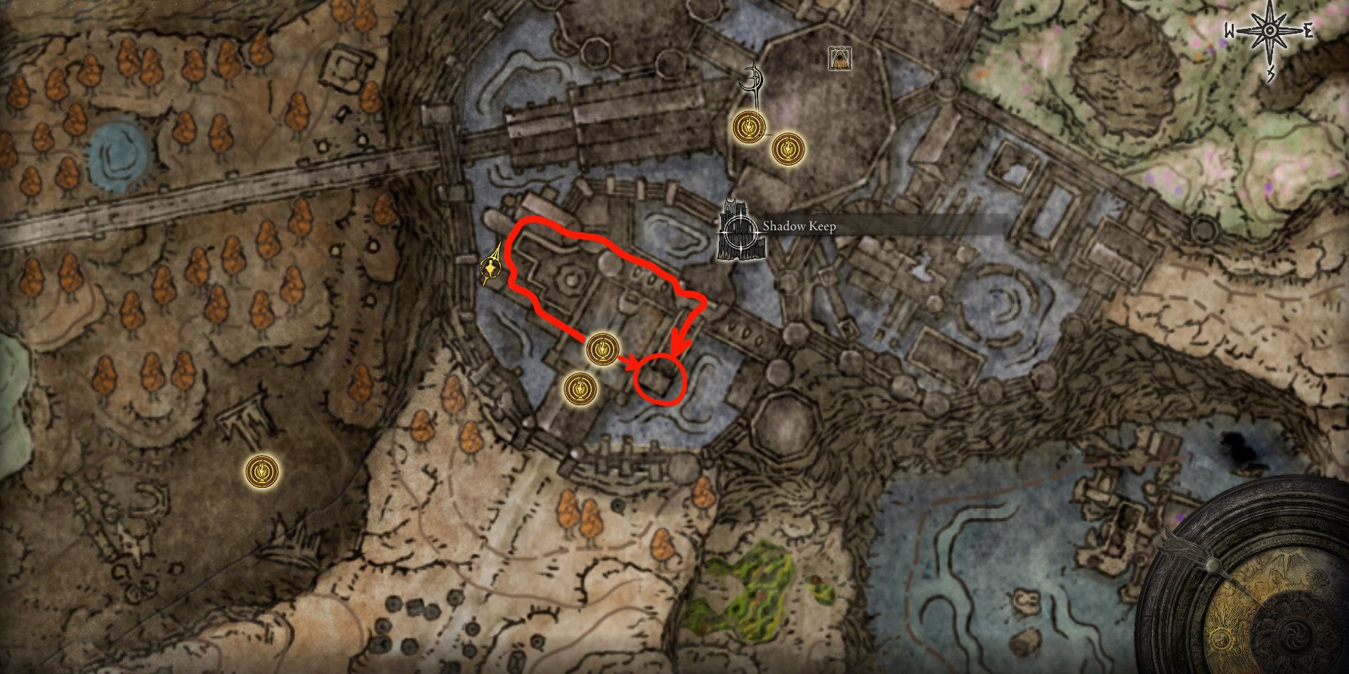 Доберитесь до главного входа в Крепость Теней, площади Главных ворот. Оказавшись там, идите направо к юго-восточным воротам. Вы встретите группу из четырех теневых ополченцев, охраняющих вход. Используйте заклинание или способность «Пепел войны», чтобы уничтожить их и собрать добычу. После этого вернитесь на Место Благодати и повторяйте эту процедуру, пока не получите полный набор.