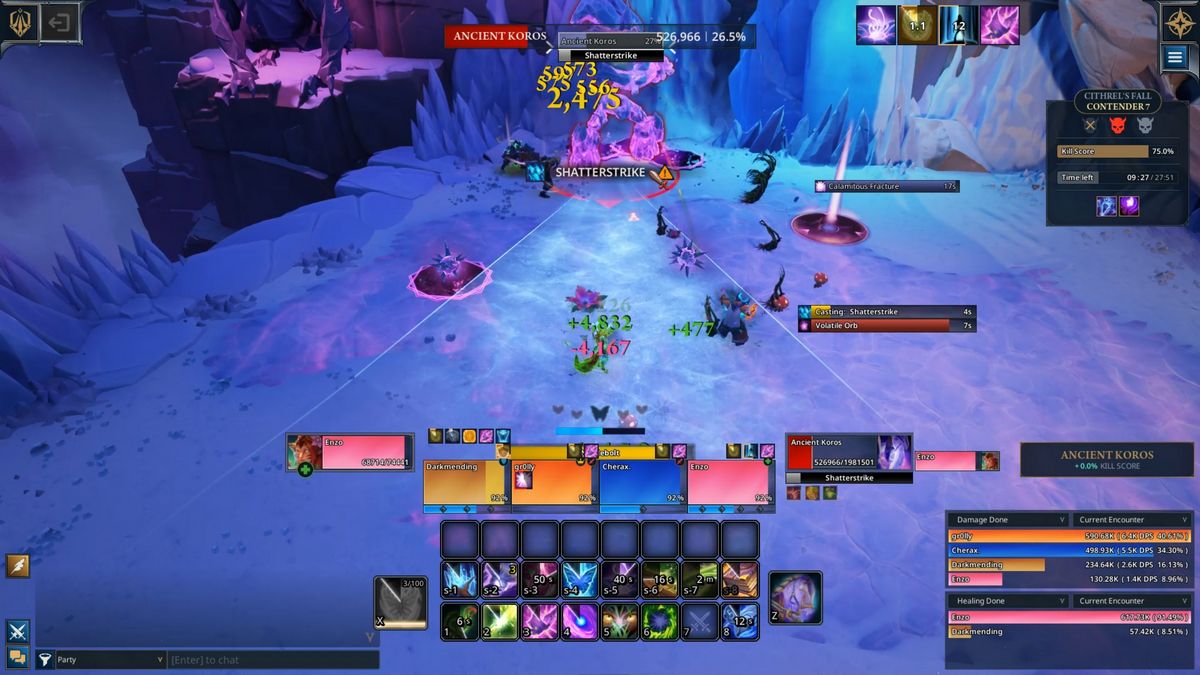 Древний Корос использует атаку под названием Shatterstrike, которая поражает всех в конусообразной области, даже танка, и её нельзя избежать. Вы можете увидеть, как выглядит атака, на изображении выше.