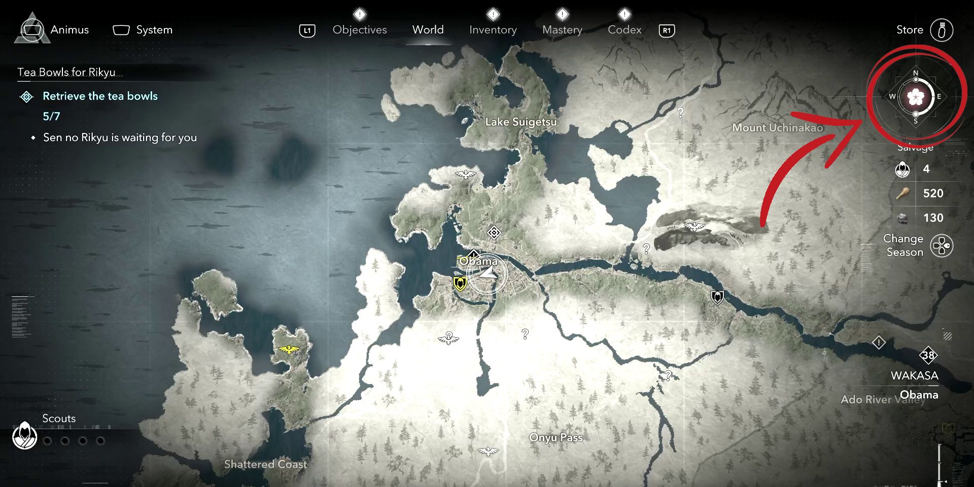 В игре ‘Assassin’s Creed Shadows’ игроки могут изменить время года в игре, перейдя на экран карты мира и нажав вправо на крестовине. Однако есть важное условие: компас в правом верхнем углу экрана должен быть либо полностью заполнен, либо наполовину заполнен, как показывают маленькие белые кружки рядом с севером и югом. Если эти условия соблюдены и смена сезона не происходила недавно, удерживание правой кнопки несколько секунд вызовет смену времени года.