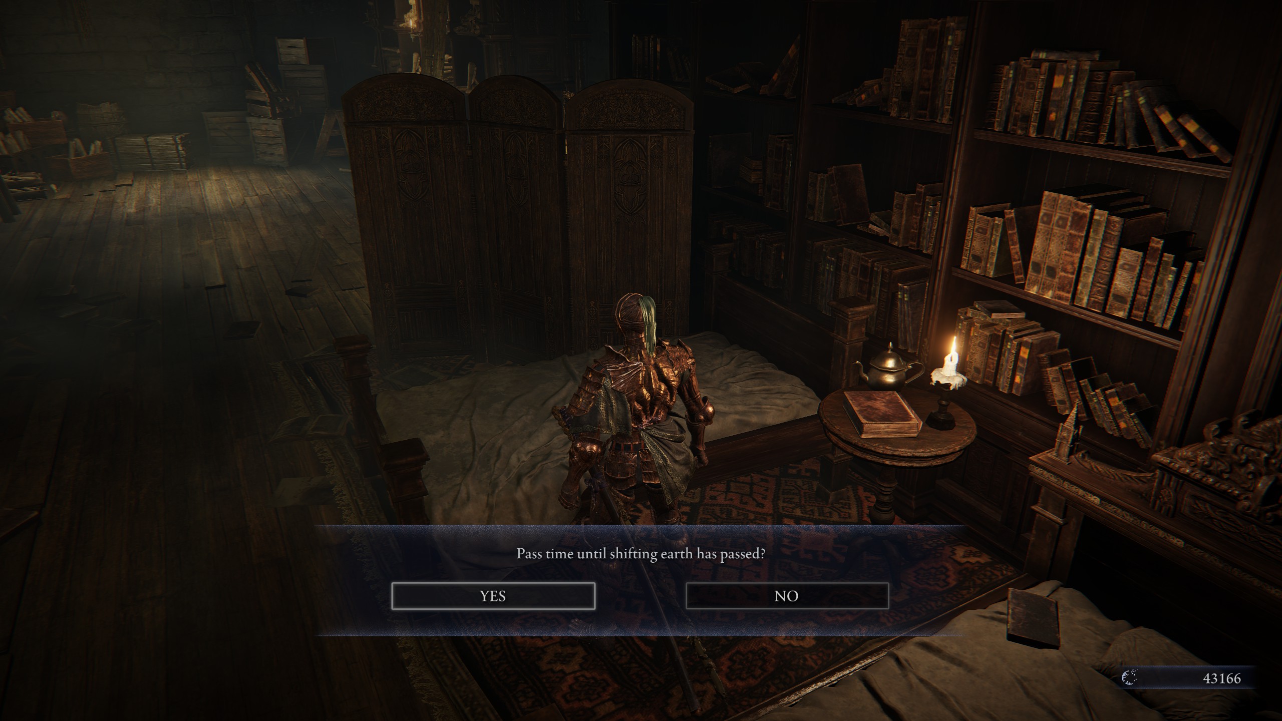 Иногда вы можете захотеть деактивировать явление Сдвинутой Земли. Отправляйтесь к кровати, расположенной в восточном крыле, затем взаимодействуйте с ней для продвижения времени. Убедитесь, что вы хотите продолжать продвижение до конца события сдвинутой земли, после чего карта Лимвельда вернется к своему изначальному состоянию. Этот район находится поблизости от места, где можно сменить одежду.