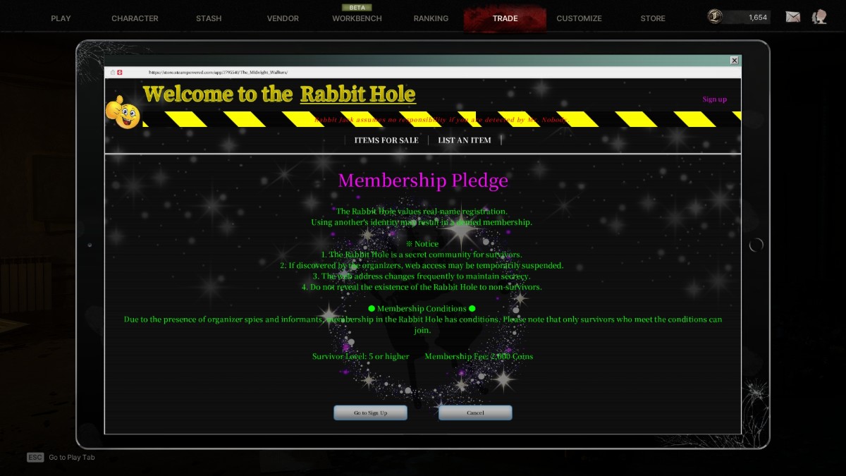 Вам нужно достичь 5 уровня, прежде чем вы сможете начать торговлю в The Midnight Walkers. Как только вы достигнете 5 уровня, вы получите сообщение о том, что Rabbit Hole открыт, и вы сможете получить доступ к разделу торговли из главного меню.
